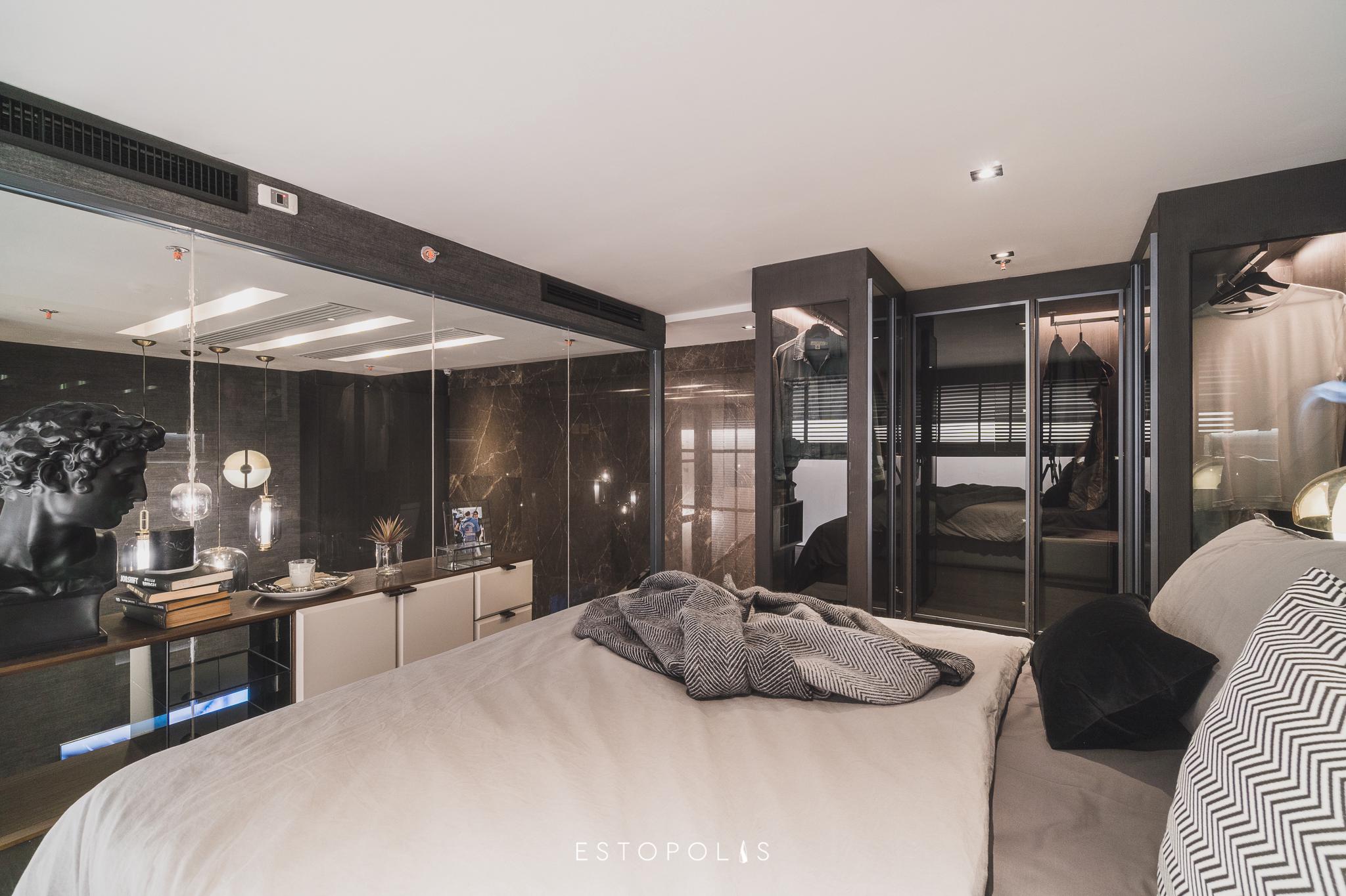 เมื่อมองออกไปอีกฝั่งห้องจะเจอกับตู้เสื้อผ้าบิลท์อิน (Built-in) แบบ Walk-in closet เอาใจเหล่าแฟชั่นนิสต้าที่รักในการแต่งตัวด้วยจำนวนตู้เสื้อผ้าจัดเต็มให้ถึง 3 ตู้ เป็นรูปตัว U