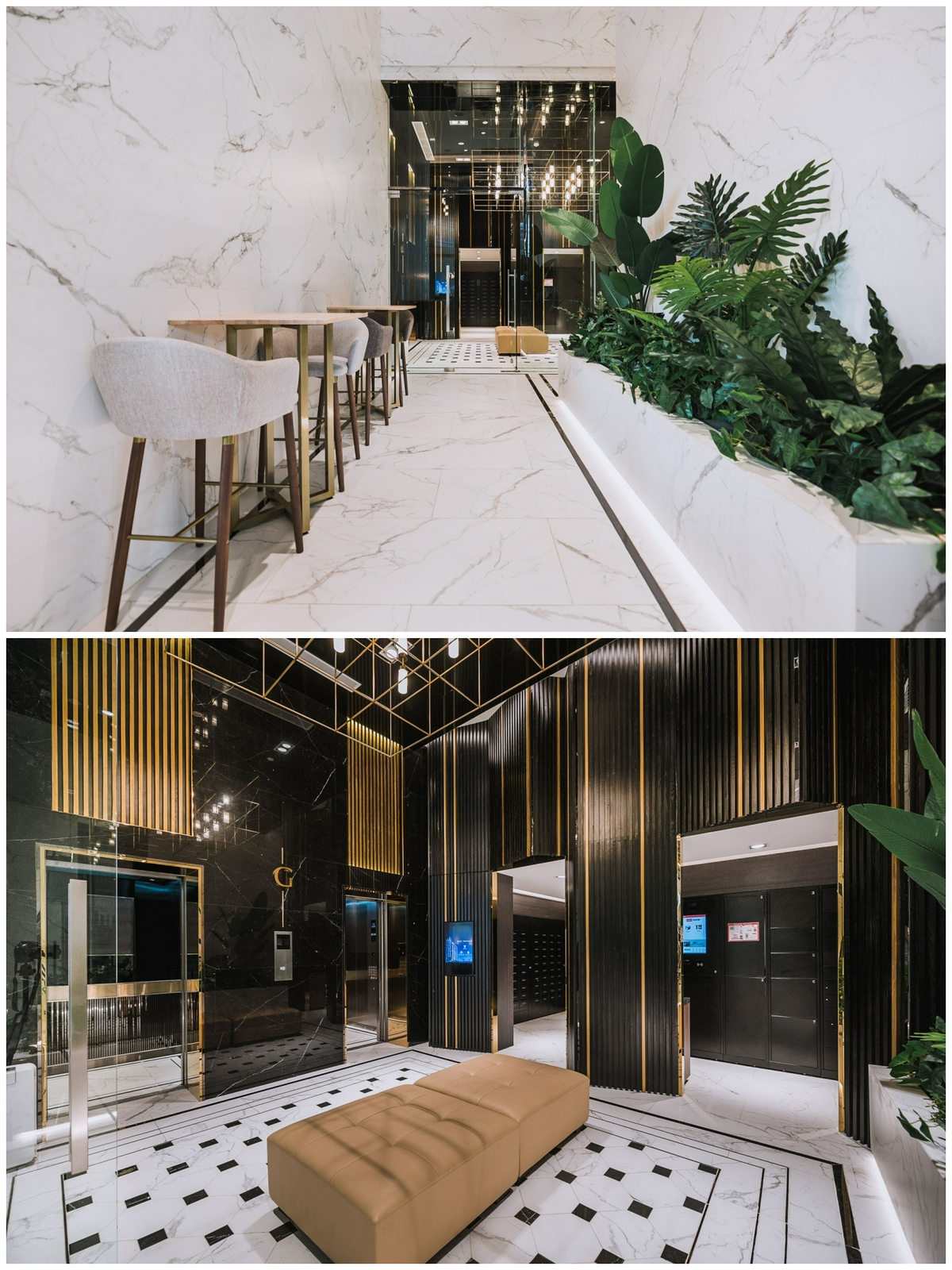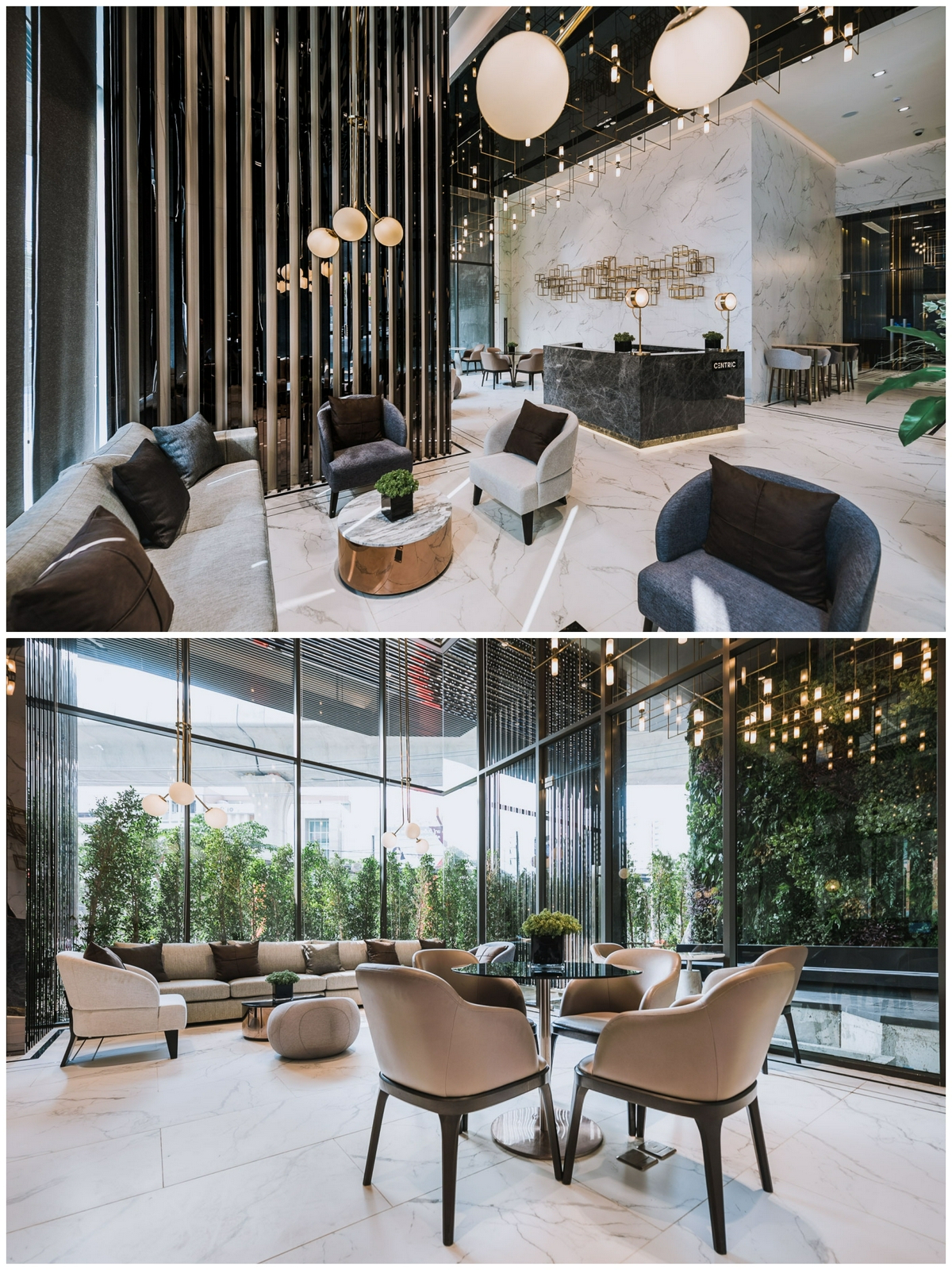 Grand Lobby ให้บรรยากาศปลอดโปร่ง โล่งกว้างด้วยเพดานแบบ Double Volume สูง 5.5 เมตร ภายในตกแต่งสไตล์โมเดิร์น หรูหรา และยังได้ความสดชื่นจากต้นไม้สีเขียวที่ประดับอยู่รอบ ๆ พื้นที่ ซึ่งเราสามารถมองเห็นได้ผ่านทางกระจกใสบานสูง พร้อมด้วยจุดบริการเคาน์เตอร์ Reception หินอ่อน Black Emperado และมุมพักผ่อนสำหรับนั่งรอรถส่วนตัว ส่วนใครที่อยากใกล้ชิดธรรมชาติขึ้นมาอีกนิด บริเวณด้านนอกจะมีมุม Semi Outdoor Lobby ติดผนัง Green Wall ไว้ให้เปลี่ยนบรรยากาศกันอยู่ด้วย