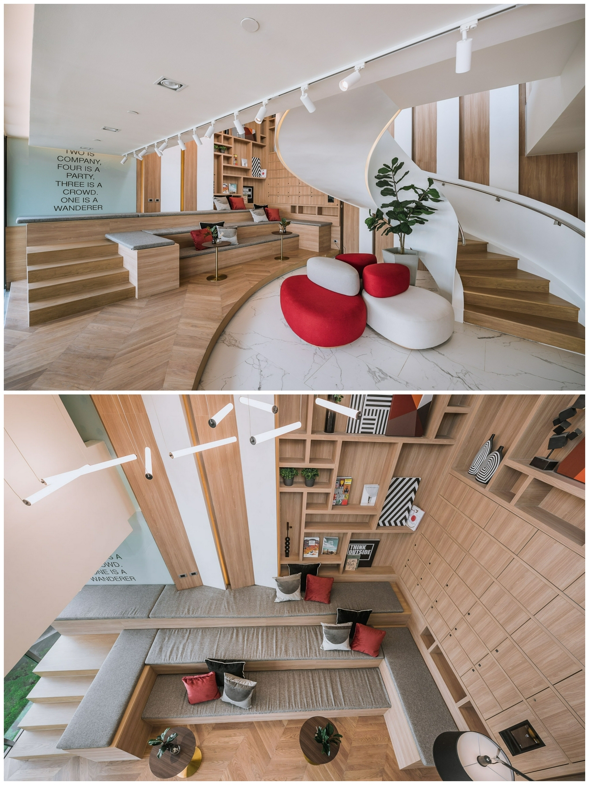 โซน Lower Floor บริเวณชั้น 3 : Co-Living Space พื้นที่นั่งพักผ่อนในบรรยากาศแสนสบาย เหมาะจะมาเอนกายพิงเบาะนุ่ม ๆ พร้อมถือหนังสือเล่มโปรดมานั่งอ่านสักเล่ม โดยภาพลักษณ์ของโซนนี้จะมีความผ่อนคลาย และเป็นกันเองมากกว่าโซนอื่นเล็กน้อย ทั้งยังมีตู้ Built-in Locker สำหรับใช้เก็บของมีค่าส่วนตัว เวลาที่ต้องการไปเข้าห้องน้ำ หรือไปทำธุระอื่น ๆ