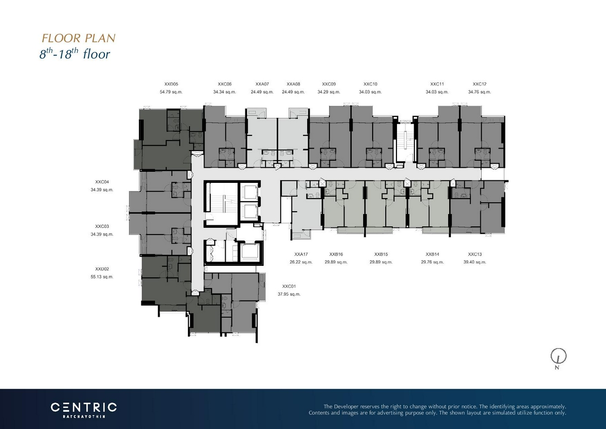 ส่วนบนชั้น 7 - 18 จะเป็นชั้นที่มีห้องพักอาศัยมากที่สุด อยู่ที่ 17 ยูนิตต่อชั้น ประกอบไปด้วย…