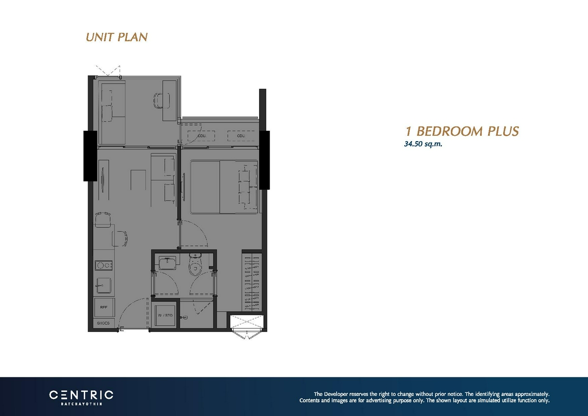 สำหรับแปลนห้องแบบ 1 Bedroom Plus นี้ อาจนับเป็น Signature Layout ของทางโครงการ Centric Ratchayothin เลยก็ว่าได้ ด้วยลักษณะแปลนที่เน้นให้ทุกห้องสามารถมองเห็นวิวได้ อีกทั้งยังมีห้องอเนกประสงค์ ที่เจ้าของห้องสามารถดีไซน์ให้กลายเป็นห้องสำหรับใช้งานได้เองตามไลฟ์สไตล์ ทั้งห้องนอนเสริม ที่สามารถวางเตียงขนาด 3.5 ฟุตได้สบาย, ห้องทำงานส่วนตัว, ห้องอ่านหนังสือ ฯลฯ คุณจึงสามารถออกแบบพื้นที่ทุกตารางนิ้วได้อย่างอิสระ