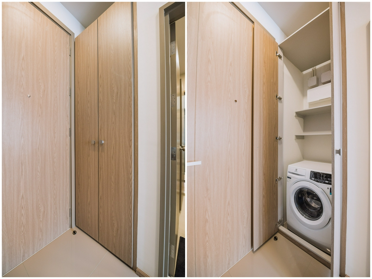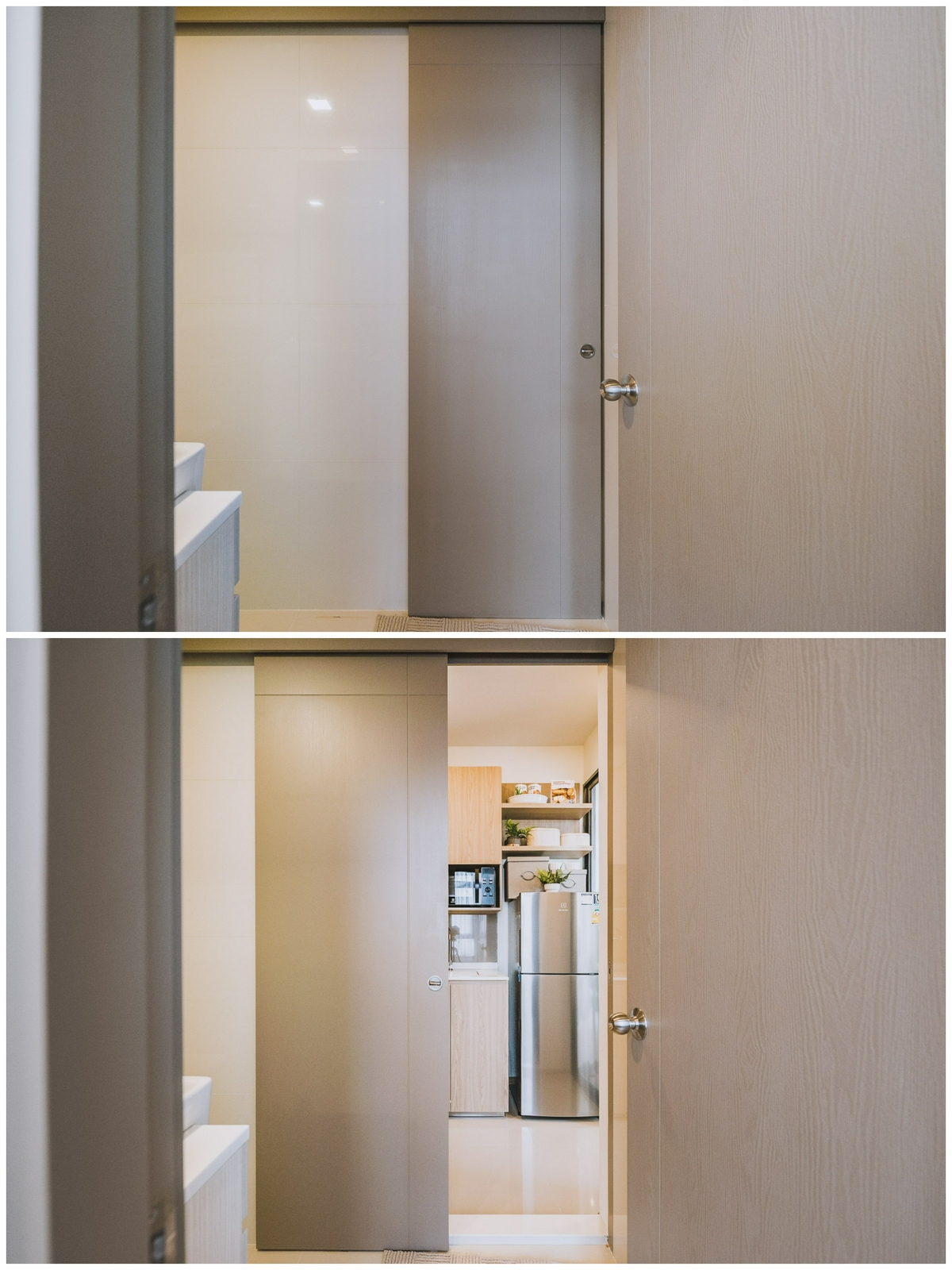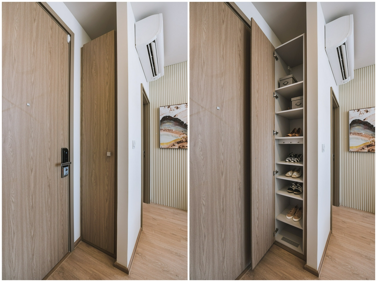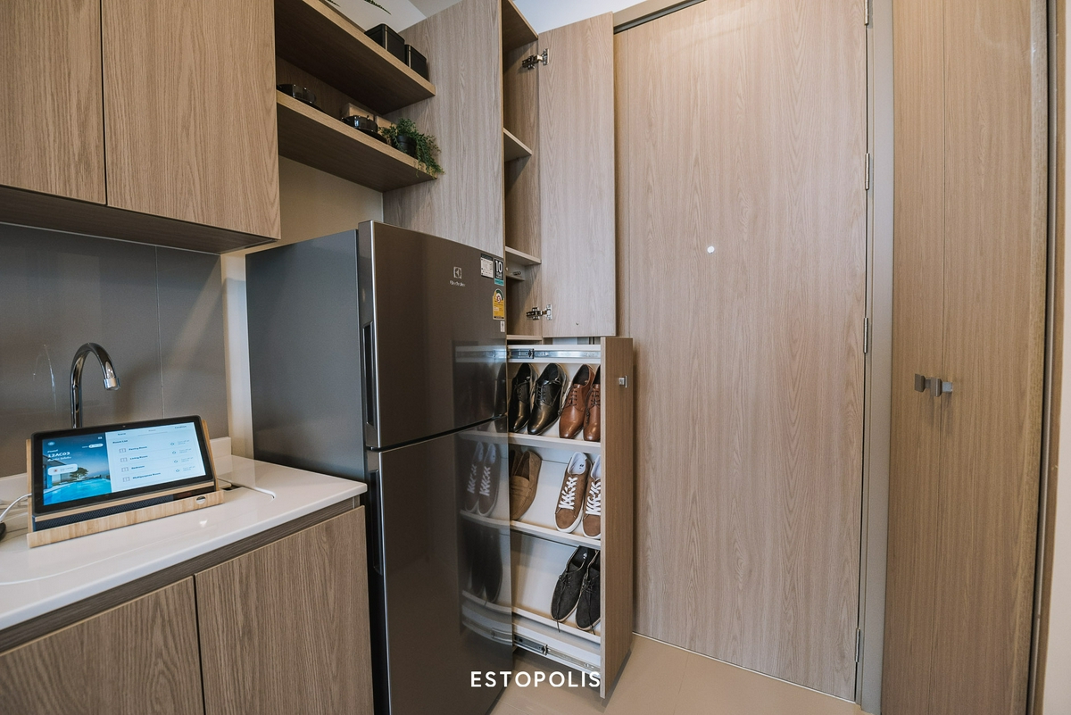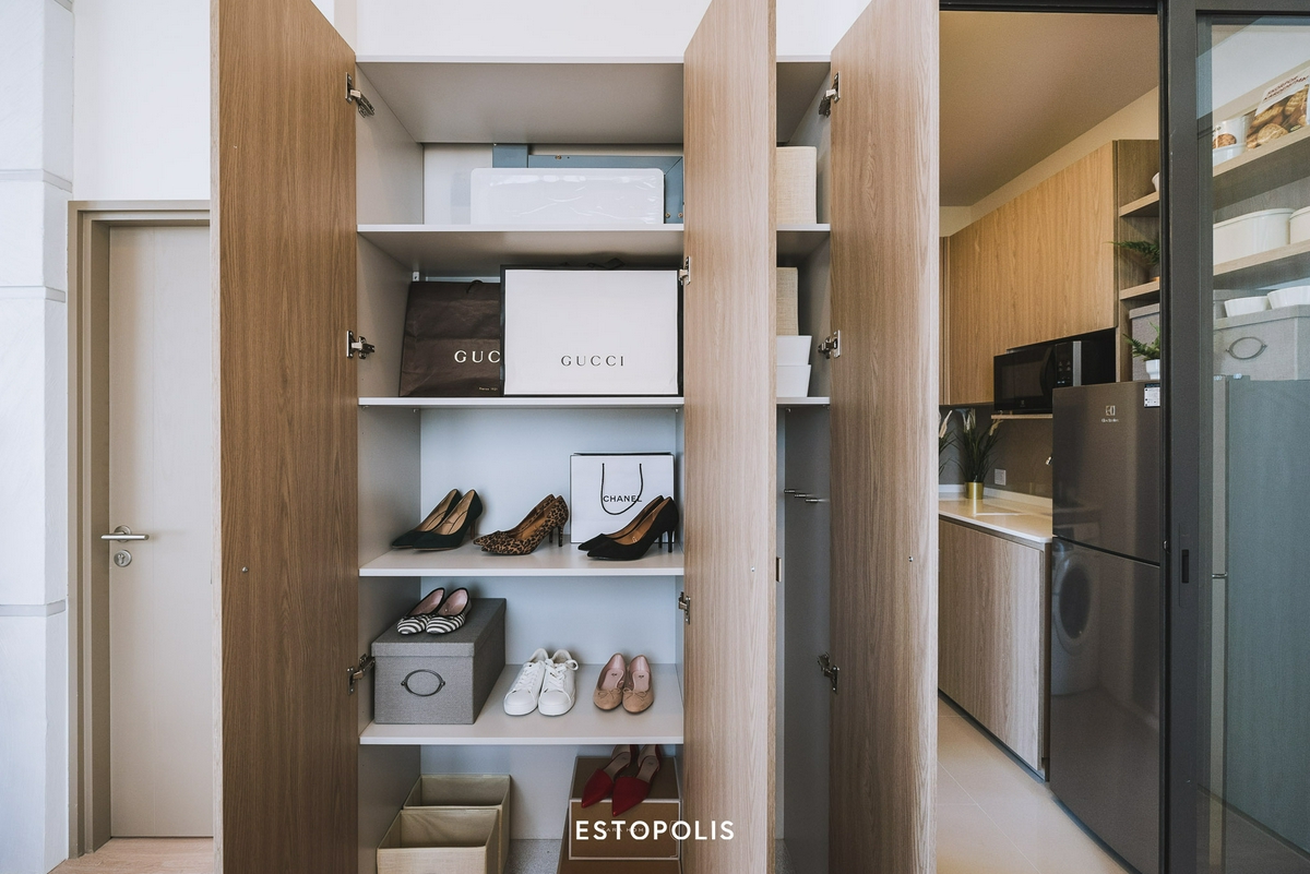 เมื่อเข้ามาดูบริเวณสองฝั่งประตูทางเข้า จะเจอกับ ‘ตู้อเนกประสงค์’ ที่ทางโครงการบิล์อินมาให้ ครบครันไปด้วยตู้เก็บรองเท้าทรงยาว ที่ออกแบบมาเพื่อช่วยประหยัดพื้นที่ใช้สอย เวลาต้องการใช้งานค่อยดึงชั้นวางออกมา ส่วนด้านบนจะเป็นตู้เก็บของ ที่สามารถใช้วางของเล็ก ๆ น้อย ๆ อย่างหมวก, กระเป๋า หรือเครื่องประดับอื่น ๆ ที่เราต้องการหยิบใช้ก่อนออกจากห้องได้