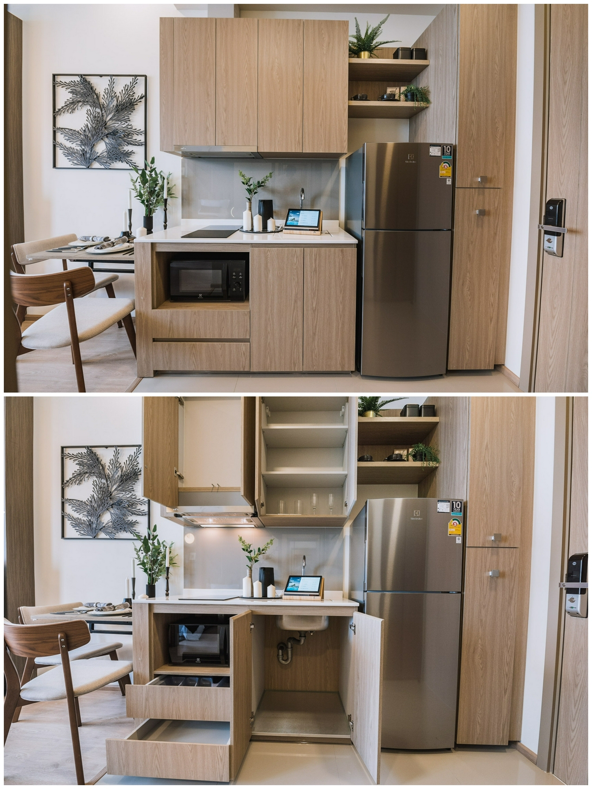 ถัดมาจะเป็นพื้นที่ของ “ครัวเปิด” ที่ทางโครงการ Centric Ratchayothin ได้บิลต์อินชุดครัวมาให้ครบชุด ทั้งเคาน์เตอร์ครัวตั้งพื้น และตู้แขวนผนังด้านบน โดยภายในจะแบ่งพื้นที่จัดเก็บของไว้หลากฟังก์ชัน เช่น ชั้นวาง, ตู้ และลิ้นชักเก็บของ เพื่อให้เราสามารถใช้จัดเก็บอุปกรณ์ทำครัว, ภาชนะ, วัตถุดิบ, ของแห้งต่าง ๆ ได้เพียงพอ พร้อมเว้นช่องสำหรับใส่เตาไมโครเวฟ และตู้เย็นเอาไว้ให้ด้วย