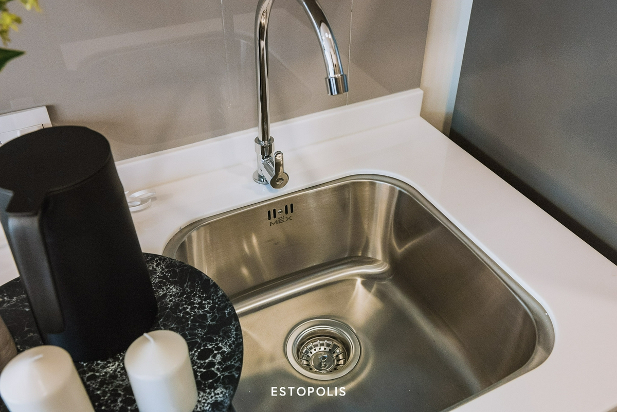 บริเวณ Top ครัวจะเป็นวัสดุหินสังเคราะห์สีขาว ซึ่งมีความทนทาน แข็งแรงกว่าหินธรรมชาติ สามารถรองรับการใช้งานครัวได้ดีพอสมควร จึงเหมาะกับคนที่ชอบทำครัวเป็นประจำ นอกจากนี้ทางโครงการยังกรุ Back Splash ด้วยกระเบื้องแกรนิตโต้สีเทา ทำให้เราสามารถเช็ดทำความสะอาดคราบน้ำมัน หรือร่องรอยอื่น ๆ ได้ง่ายดาย พร้อมกับฝาปิดซิงก์ ตัวช่วยที่จะทำให้การเตรียมอาหารแต่ละครั้งสะดวกยิ่งขึ้น