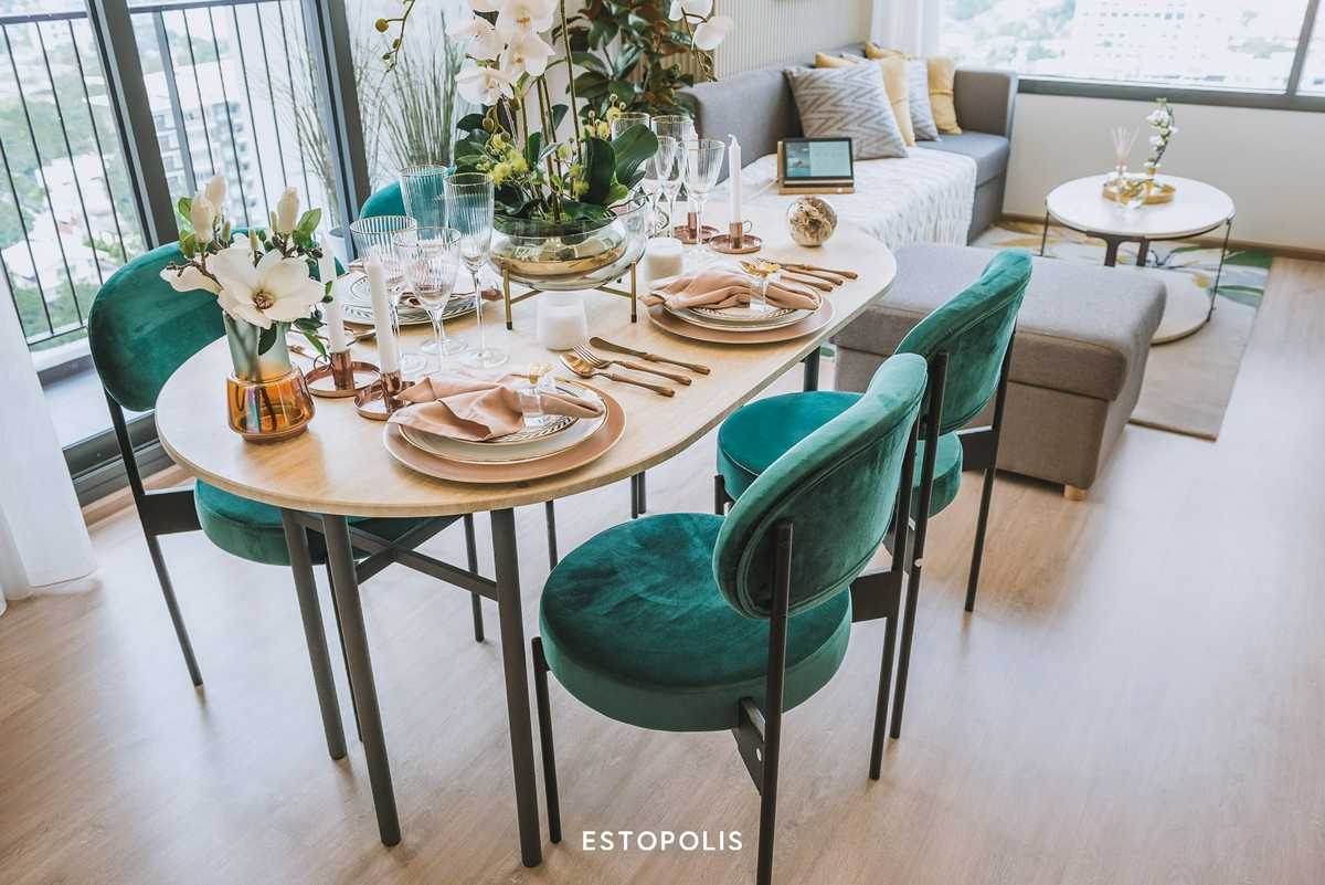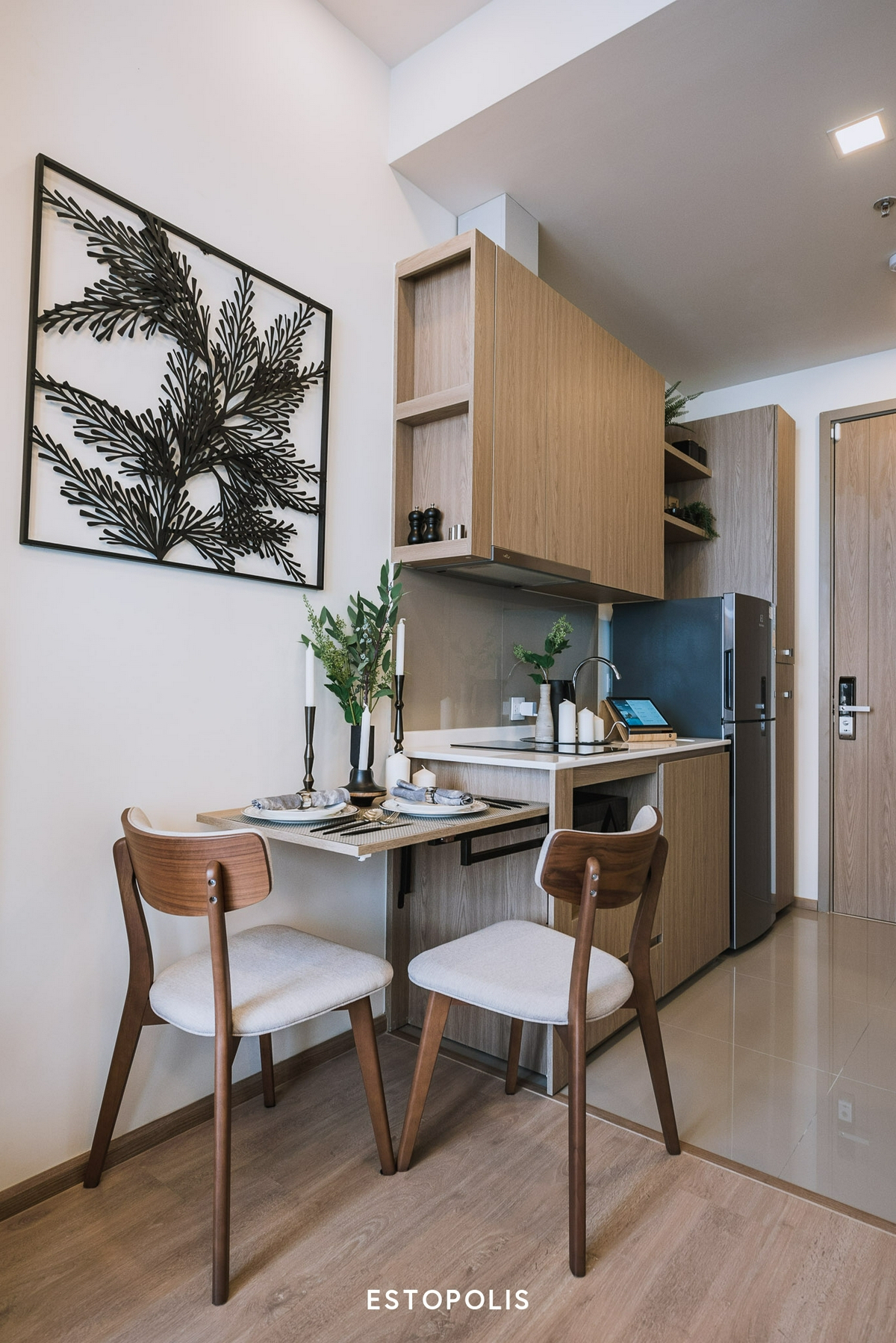 อีกหนึ่งฟังก์ชันที่น่าสนใจ จะเป็นโต๊ะทานข้าวแบบพับเก็บได้ ที่ทางโครงการเลือกมาให้ตอบโจทย์การประหยัดพื้นที่ใช้สอย นอกจากนี้ยังมีเก้าอี้ทานข้าวอีก 2 ตัว ส่วนใครอยากวางเครื่องปรุง อย่างเกลือ, พริกไทย, ซอสมะเขือเทศ ก็สามารถจัดวางไว้ที่ชั้นวางด้านบนได้เลย นับเป็นการออกแบบที่ใส่ใจถึงรายละเอียด และยังช่วยประหยัดพื้นที่ใช้สอยได้เป็นอย่างดีอีกด้วย
