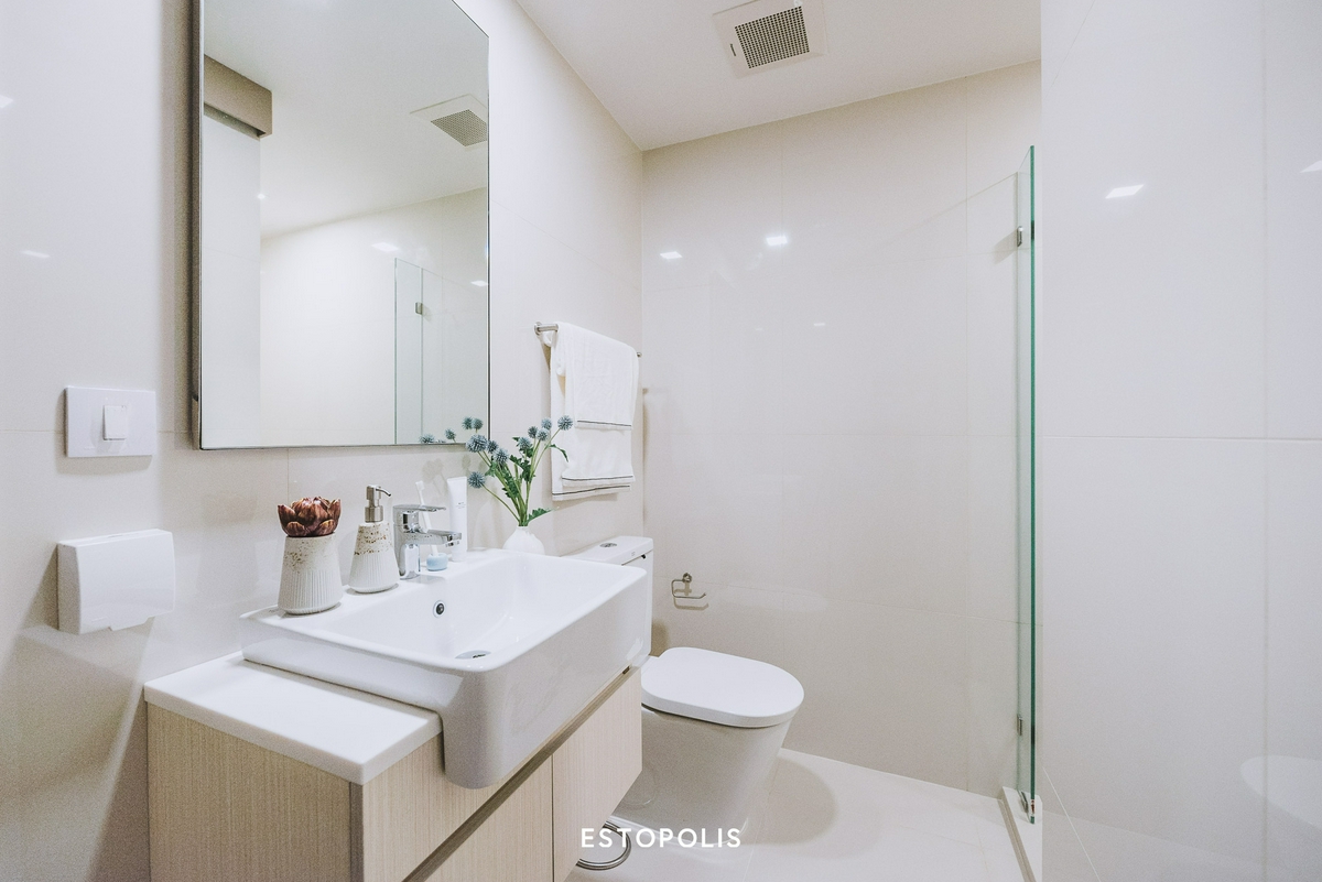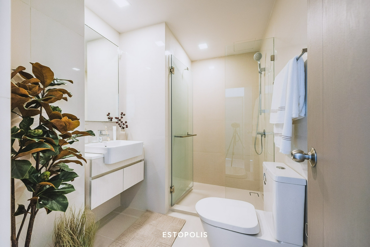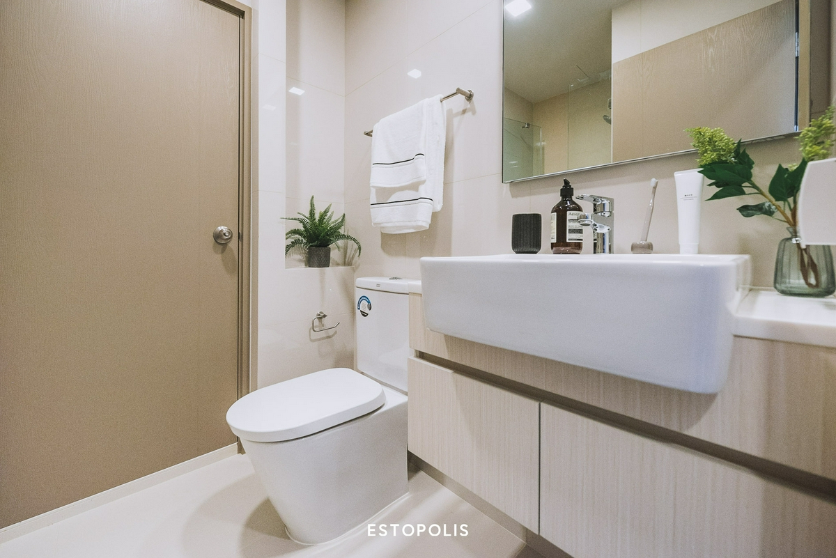 สำหรับ “ห้องน้ำส่วนตัว” จะมีพื้นที่ค่อนข้างกว้าง ดูปลอดโปร่ง ไม่ทำให้รู้สึกอึดอัด พร้อมแบ่งแยกโซนเปียกกับโซนแห้งออกจากกันด้วย Partition กระจกใส ด้านสุขภัณฑ์ภายในก็ให้มาครบครัน ทั้งเคาน์เตอร์อ่างล้างหน้า, บานกระจกเงา, ปลั๊กไฟพร้อมกล่องปิด, โถสุขภัณฑ์, สายชำระ, ที่ใส่กระดาษทิชชู่, ราวแขวนผ้าขนหนู และ Hand Shower โดยทางโครงการจะเลือกใช้ผลิตภัณฑ์จากแบรนด์คุณภาพอย่าง American Standard ทั้งหมด