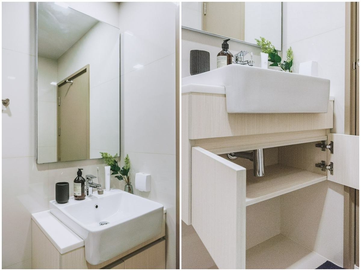 สำหรับอ่างล้างหน้าที่ทางโครงการเลือกใช้นั้น จะเป็นของแบรนด์ American Standard แบบครบชุด โดยบริเวณขอบอ่างจะมีพื้นที่ให้วางผลิตภัณฑ์ต่าง ๆ ได้พอสมควร ส่วนบริเวณผนังใกล้ ๆ กันก็จะมีกล่องซ่อนปลั๊กไฟเอาไว้ให้ สำหรับการใช้งานเสียบไดร์เป่าผม และอุปกรณ์ไฟฟ้าอื่น ๆ ได้อย่างปลอดภัย นอกจากนี้ยังมีเคาน์เตอร์สำหรับใช้จัดเก็บของใช้เพิ่มเติมได้ด้วย