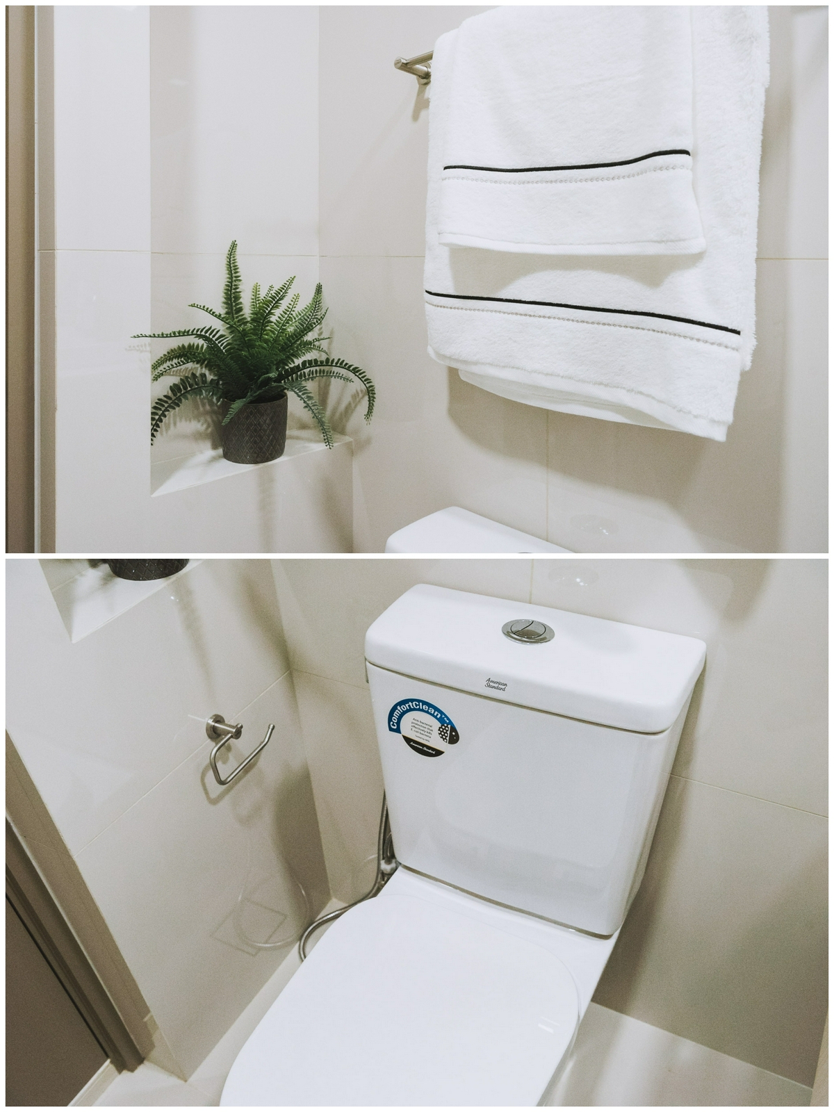 ขยับมาต่อที่โถสุขภัณฑ์ ซึ่งทางโครงการก็จัดมาให้ครบ เข้าชุดทั้งสายชำระ และแกนใส่กระดาษทิชชู่จากแบรนด์ American Standard โดยบริเวณด้านข้างจะมีการ Drop Wall เอาไว้ให้เราใช้วางต้นไม้ เพื่อเพิ่มความสดชื่น, จัดเทียนหอมอโรม่ากลิ่นโปรด หรือจะใช้วางผลิตภัณฑ์บำรุงผิวอื่น ๆ ตามใจชอบ