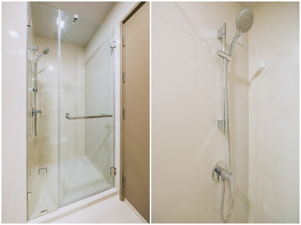 ย้ายมาฝั่งของ Shower Box ที่กั้นด้วย Partition กระจกใสกันต่อ โดยด้านหน้าประตูจะมีราวจับ ให้ใช้แขวนผ้าขนหนูได้ในตัว ส่วนภายในห้องอาบน้ำ ทางโครงการก็จะติดตั้งชุดฝักบัวแบบ Hand Shower จากแบรนด์ American Standard ไว้ให้พร้อม