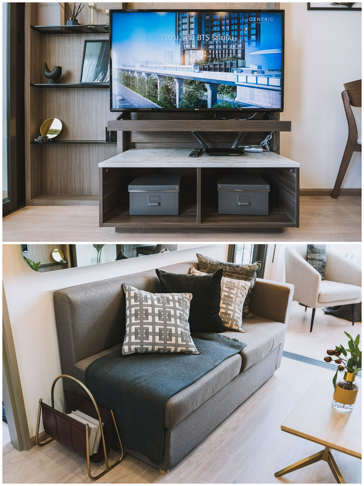 ซึ่งทางโครงการ Centric Ratchayothin ก็ได้ติดตั้งเครื่องปรับอากาศ Daikin ไว้ให้จำนวน 1 เครื่อง พร้อมจัดวางมุมนั่งรับชมทีวีไว้ในตำแหน่งที่ลงตัว ไม่ติดกันจนใกล้จนเกินไป ทำให้เราสามารถแขวนโทรทัศน์ขนาดประมาณ 40 นิ้วได้พอดี หรือถ้าใครอยากได้พื้นที่จัดเก็บของเพิ่ม ก็สามารถบิลต์อินชั้นติดผนังเองได้ตามต้องการ