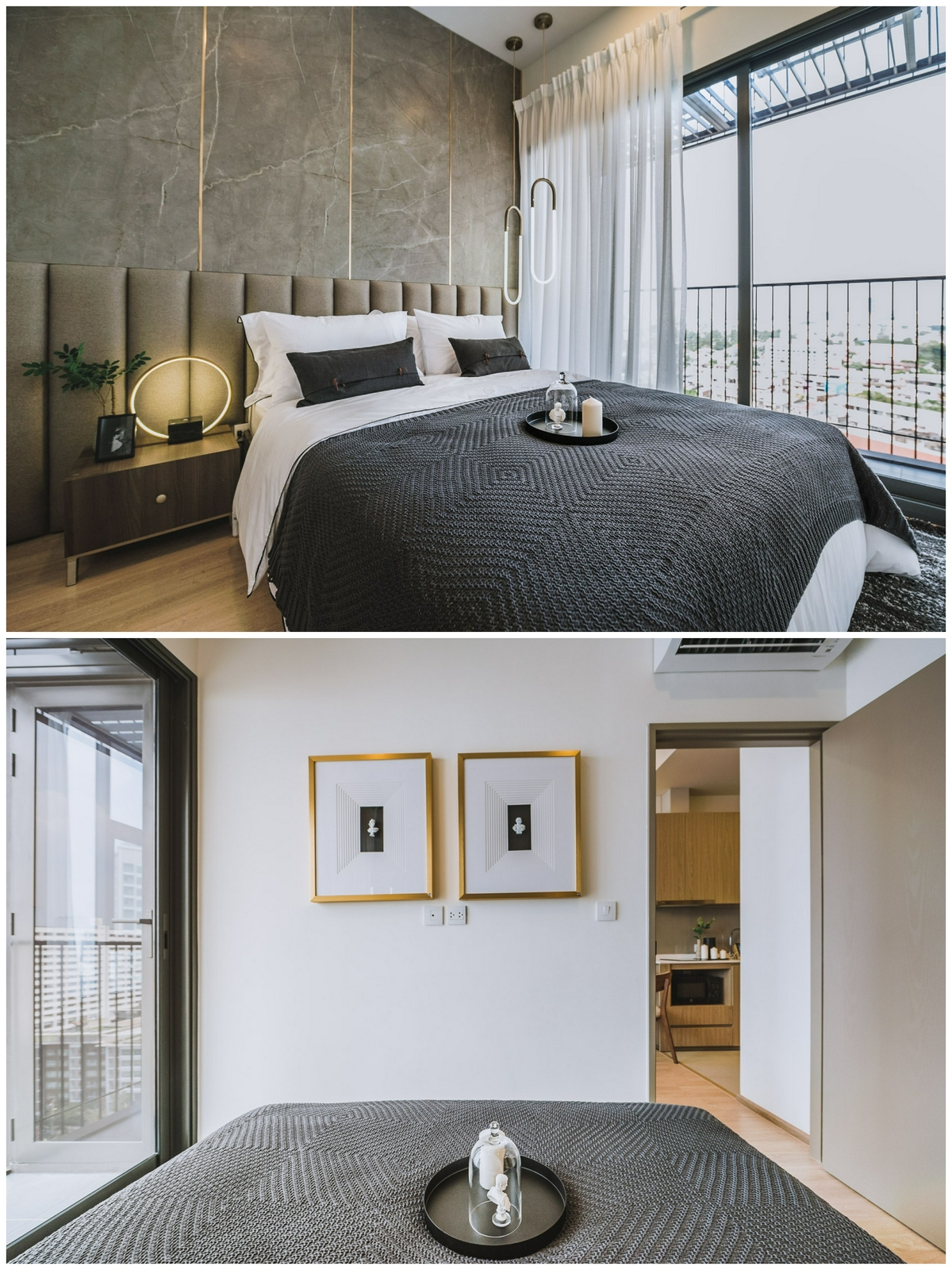 อีกทั้งยังมีความสูงจากพื้นถึงเพดานมากถึง 3 เมตร ช่วยเปิดรับแสงธรรมชาติ พร้อมวิวสวย ๆ ได้อย่างสมบูรณ์แบบ โดยทางโครงการจะติดตั้งเครื่องปรับอากาศจาก Daikin มาให้ 1 เครื่อง อยู่บริเวณเหนือประตูทางเข้าของห้องนอน Master Bedroom 1 ด้วย