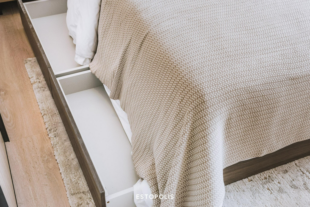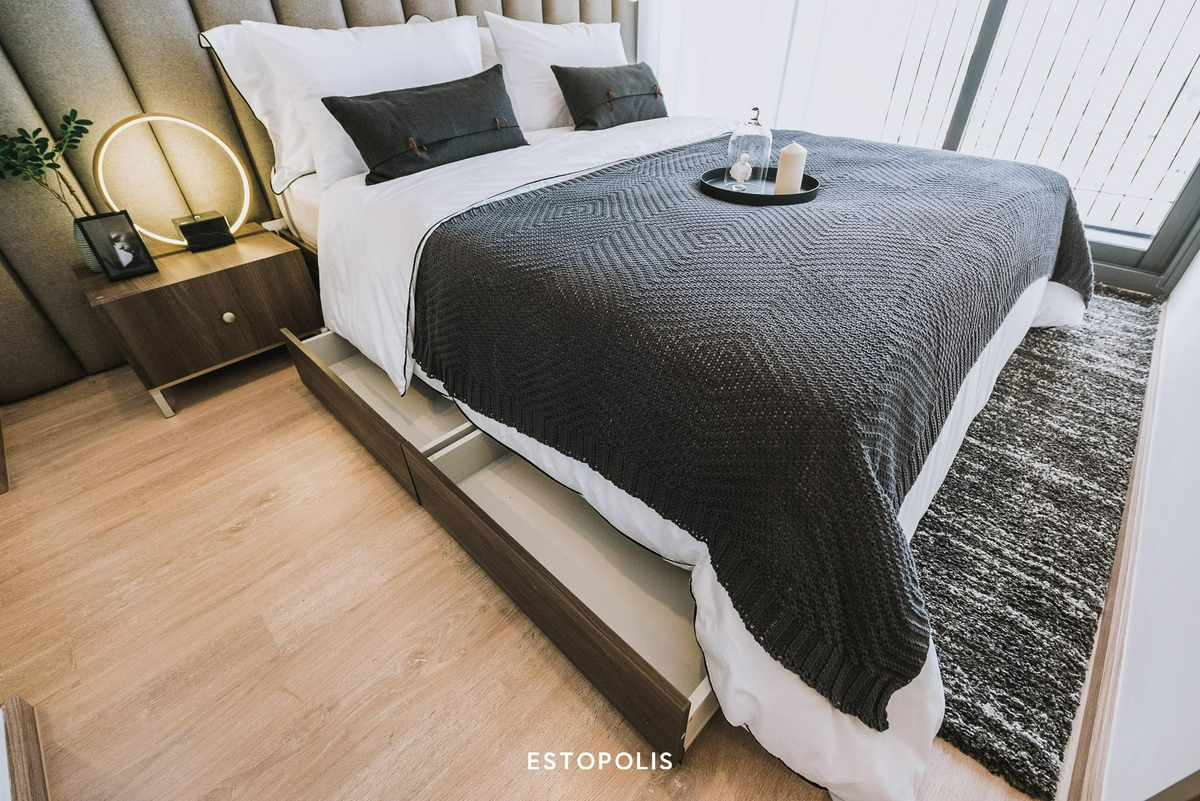ฐานเตียงที่ทางโครงการให้มา จะซ่อนลิ้นชักขนาดใหญ่ไว้ 2 ช่องเช่นเดียวกับห้องตัวอย่าง สำหรับใช้จัดเก็บข้าวของเพิ่มเติมโดยไม่เกะกะพื้นที่รอบ ๆ