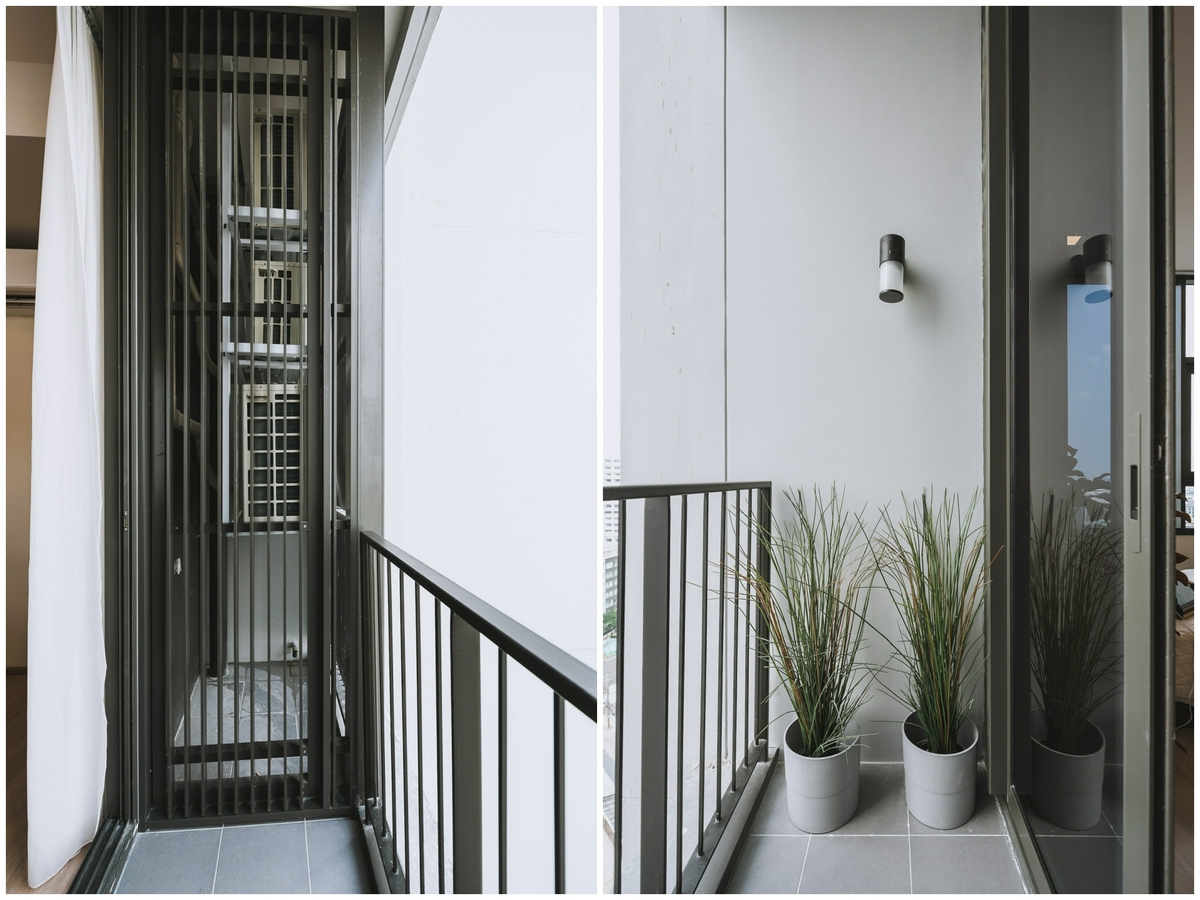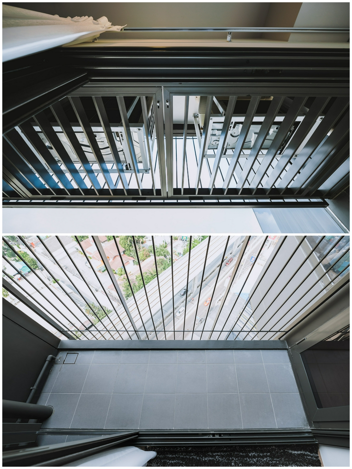 ซ้ายมือของระเบียง จะแยกสัดส่วนเป็นพื้นที่สำหรับแขวนแอร์โดยเฉพาะ พร้อมกั้นด้วยประตูเหล็ก เพื่อป้องกันไม่ให้นกเข้าไปสร้างความสกปรกได้