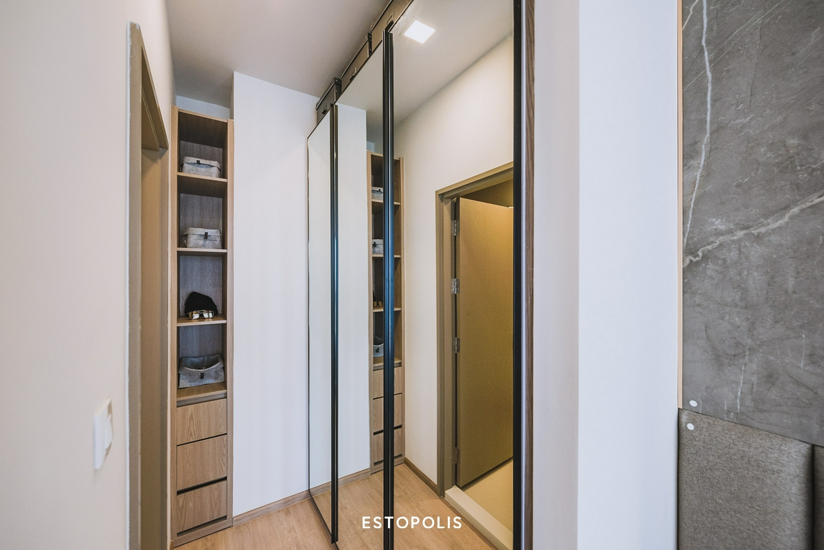 และนอกจากห้องนี้จะอยู่ติดกับระเบียงแล้ว ภายในก็ยังมีมุมดี ๆ ซ่อนอยู่ อย่าง ตู้เสื้อผ้าสไตล์ Walk Through Closet หน้าบานกระจกเงา ที่จะพาเราเชื่อมไปยังห้องน้ำได้อีกทางหนึ่งด้วย