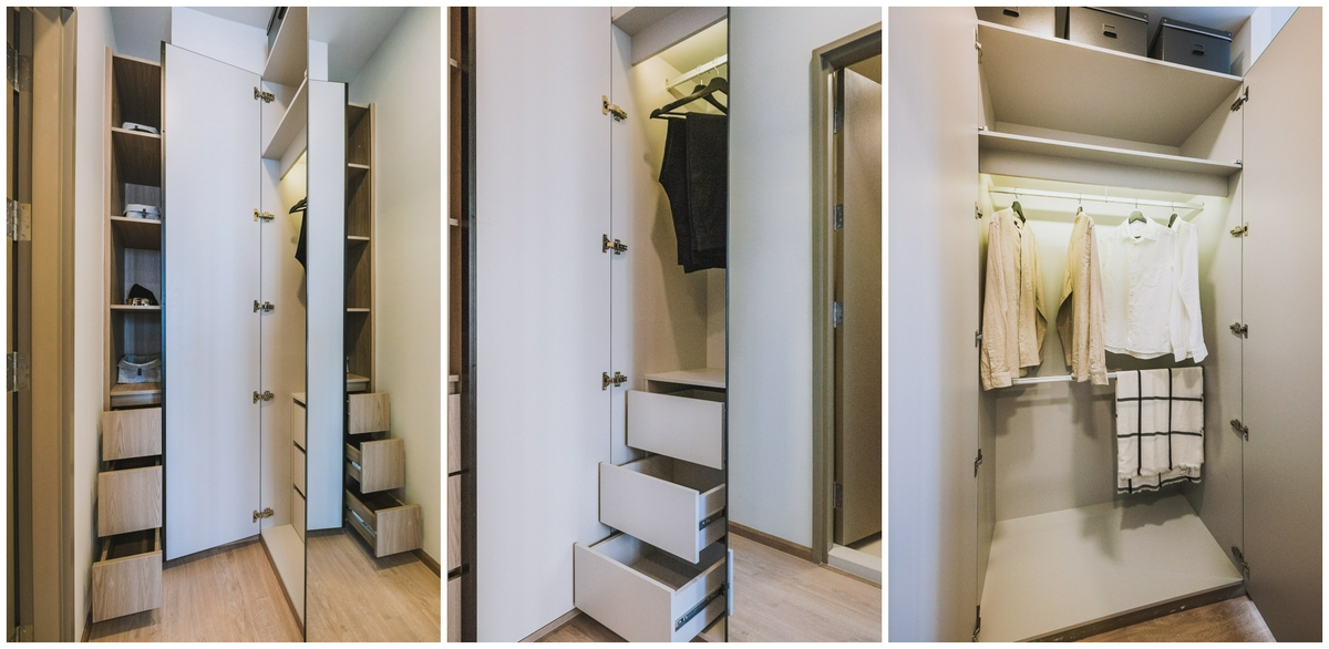 สำหรับตู้เสื้อผ้าที่ทางโครงการ Centric Ratchayothin ให้มานั้น จะออกแบบอย่างใส่ใจ สามารถใช้แขวนเสื้อผ้าได้อย่างเต็มที่ด้วยราวแขวน 2 ชิ้นบน-ล่าง ตลอดจนชั้นวางของ, ลิ้นชัก และหน้าบานกระจกเงา สำหรับใช้ตรวจดูความเรียบร้อยก่อนออกจากห้องได้ในตัว