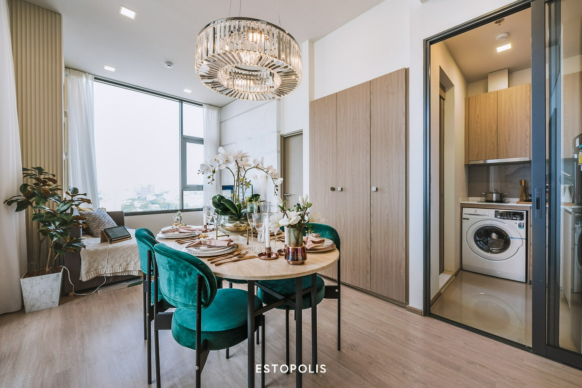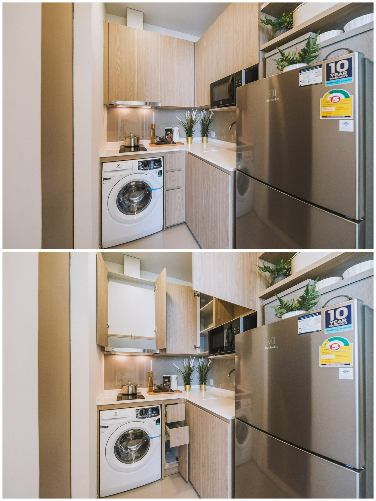 ขยับมาดูส่วนของ “ครัวปิด” กันบ้าง ซึ่งทางโครงการ Centric Ratchayothin จะให้ชุดครัวแบบเข้ามุม พร้อมตู้บิลต์อินแขวนผนังมาไว้คู่กัน โดยไม่ลืมที่จะเว้นพื้นที่สำหรับวางตู้เย็น, ไมโครเวฟ และเครื่องซักผ้าไว้ให้ด้วย ทั้งยังไม่ต้องกังวลว่าจะมีพื้นที่จัดเก็บพอหรือไม่ เพราะทางโครงการได้แบ่งฟังก์ชันมาให้ครบ ทั้งตู้เก็บของ, ลิ้นชัก และชั้นวาง ให้เราใช้จัดเก็บภาชนะ, อุปกรณ์ทำครัว, วัตถุดิบแห้ง หรือเครื่องปรุงได้เพียงพอแน่นอน