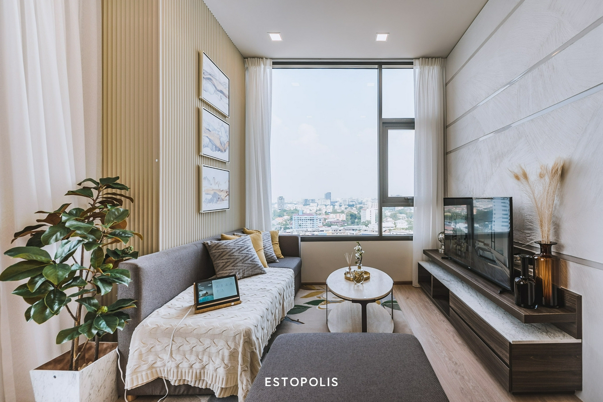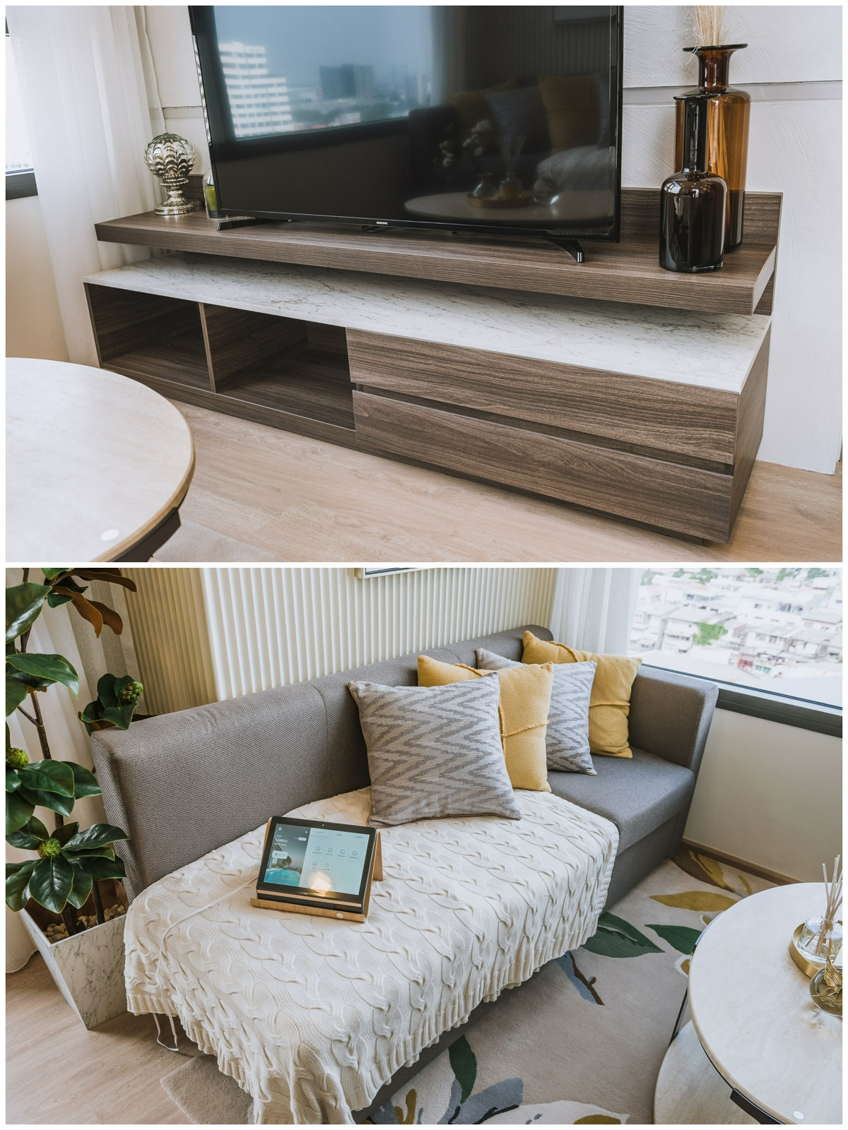 สำหรับ ‘เฟอร์นิเจอร์ภายในห้องนั่งเล่น’ ที่ทางโครงการมอบให้ด้วยนั้น จะประกอบด้วย โซฟาขนาด 2 ที่นั่ง และชั้นวางทีวีแบบเดียวกับในห้องตัวอย่าง นอกจากนี้ก็ยังได้ในส่วนของเก้าอี้สตูล สำหรับใช้จัดเก็บของและวางเท้าได้ในตัว