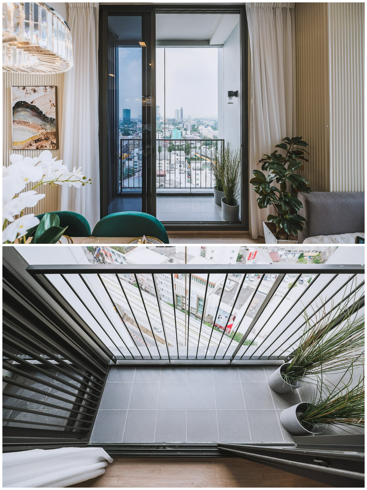 ประตูระเบียงจะใช้เป็นประตูกระจกบานเลื่อนสลับแบบ 3 ตอน ให้เราเลือกเปิดได้อย่างอิสระ โดยพื้นที่ด้านนอกจะมีขนาดค่อนข้างกว้างขวาง สามารถปลูกต้นไม้ จัดสวนริมระเบียง เพื่อเพิ่มพื้นที่สีเขียวให้กับห้องได้ หรือใครจัดเป็นมุมนั่งเล่นชิลล์ ๆ ก็ดูน่ารักไปอีกแบบ