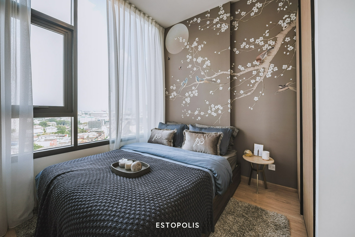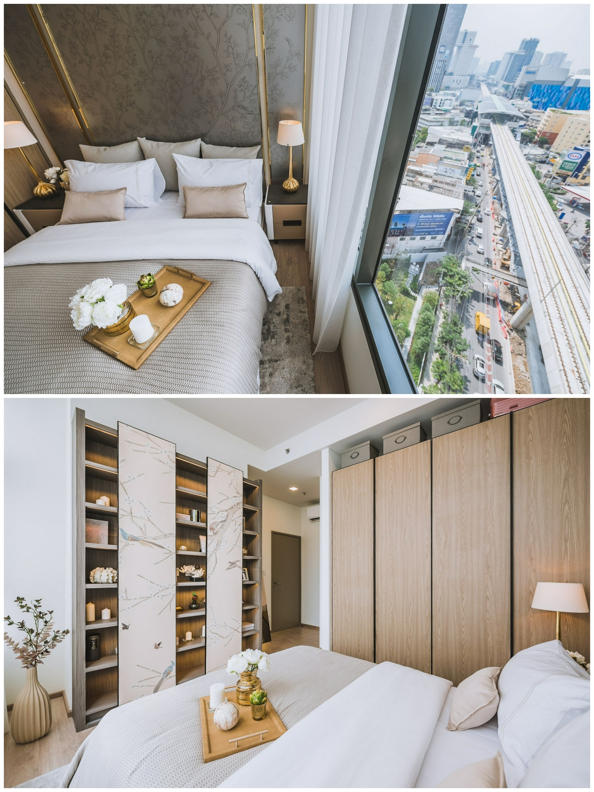 ถัดมาเป็น “ห้อง Master Bedroom 2” กับฐานเตียงขนาด 5 ฟุต ที่ทางโครงการ Centric Ratchayothin จัดวางให้เหมือนกับห้อง Master Bedroom 1 ซึ่งใต้ฐานจะซ่อนลิ้นชักเก็บของไว้ 2 ช่อง ส่วนด้านข้างเตียงก็จะอยู่ติดกับกระจกใสบานใหญ่ สามารถนอนรับวิวเมืองด้านนอกได้อย่างเต็มที่