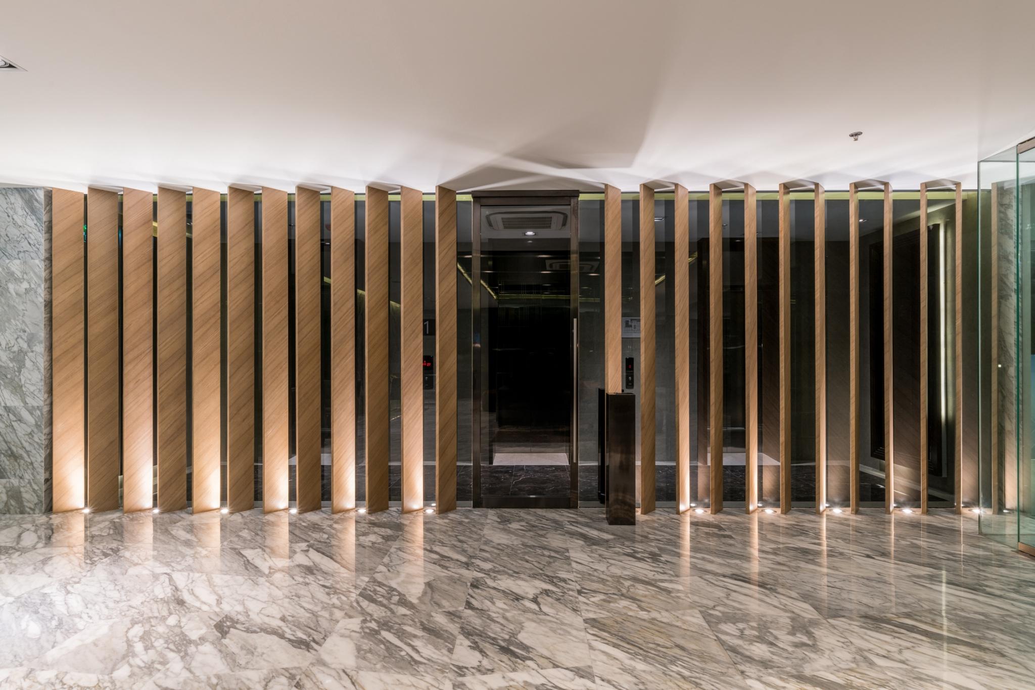 โถงลิฟท์ของโครงการ Chewathai Residence Asoke (ชีวาทัย เรสซิเดนซ์ อโศก) มีการออกแบบที่โดเด่นไม่เหมือนใครโดยการนำระแนงไม้มาตั้งวางสลับกันให้เกิดลักษณะของการบังสายตา ได้ทั้งความเป็นส่วนตัวให้แก่ลูกบ้านและดีไซต์ที่แตกต่างไม่เหมือนใคร