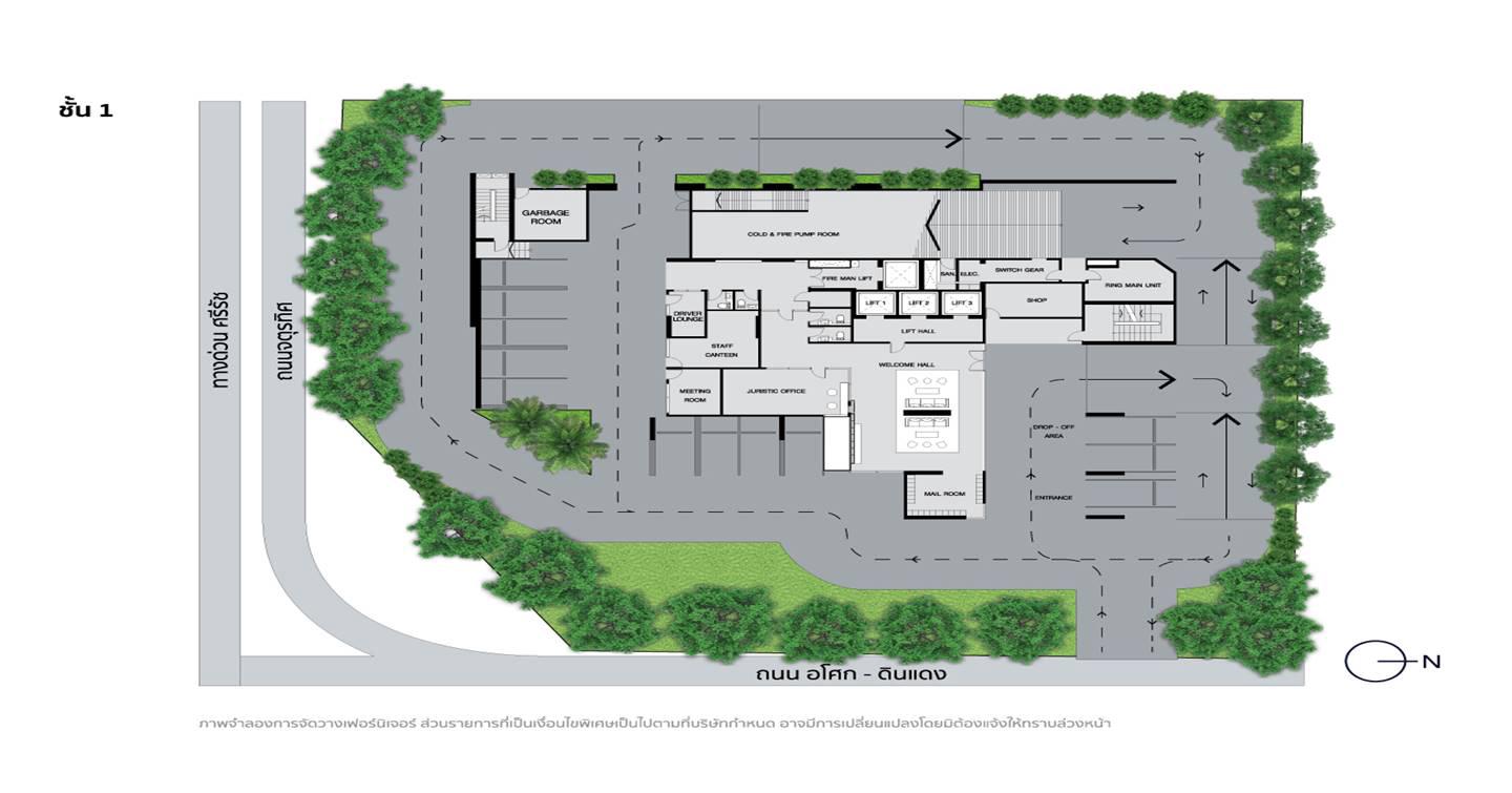 ชั้นที่ 1 พื้นที่ต้อนรับ (Welcome Hall) มาตรฐานระดับโรงแรม, ห้องนิติบุคคลฯ และห้องรับประทานอาหารพนักงาน, ห้องน้ำแขกและห้องน้ำพนักงาน, ห้องจดหมาย (Mailbox Room), ที่จอดรถ, สวน