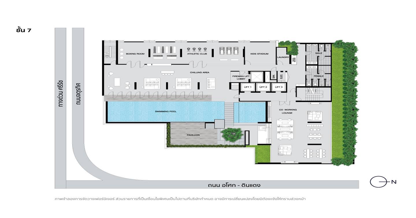 ชั้นที่ 7 พื้นที่ทำงานร่วมกัน (Co-working Lounge), พื้นที่นั่งเล่น, สระว่ายน้ำระบบโอโซนขนาดใหญ่พร้อมสระเด็ก, ห้องออกกำลังกาย, ห้องฟิตเนสขนาดใหญ่ พร้อมอุปกรณ์ชั้นนำ, ห้องสำหรับเด็ก, บริการห้องซักผ้าส่วนกลาง พร้อมอุปกรณ์เครื่องซักผ้าและเครื่องอบผ้าแบบหยอดเหรียญ, ห้องอบไอน้ำ, ห้องน้ำ, สวน