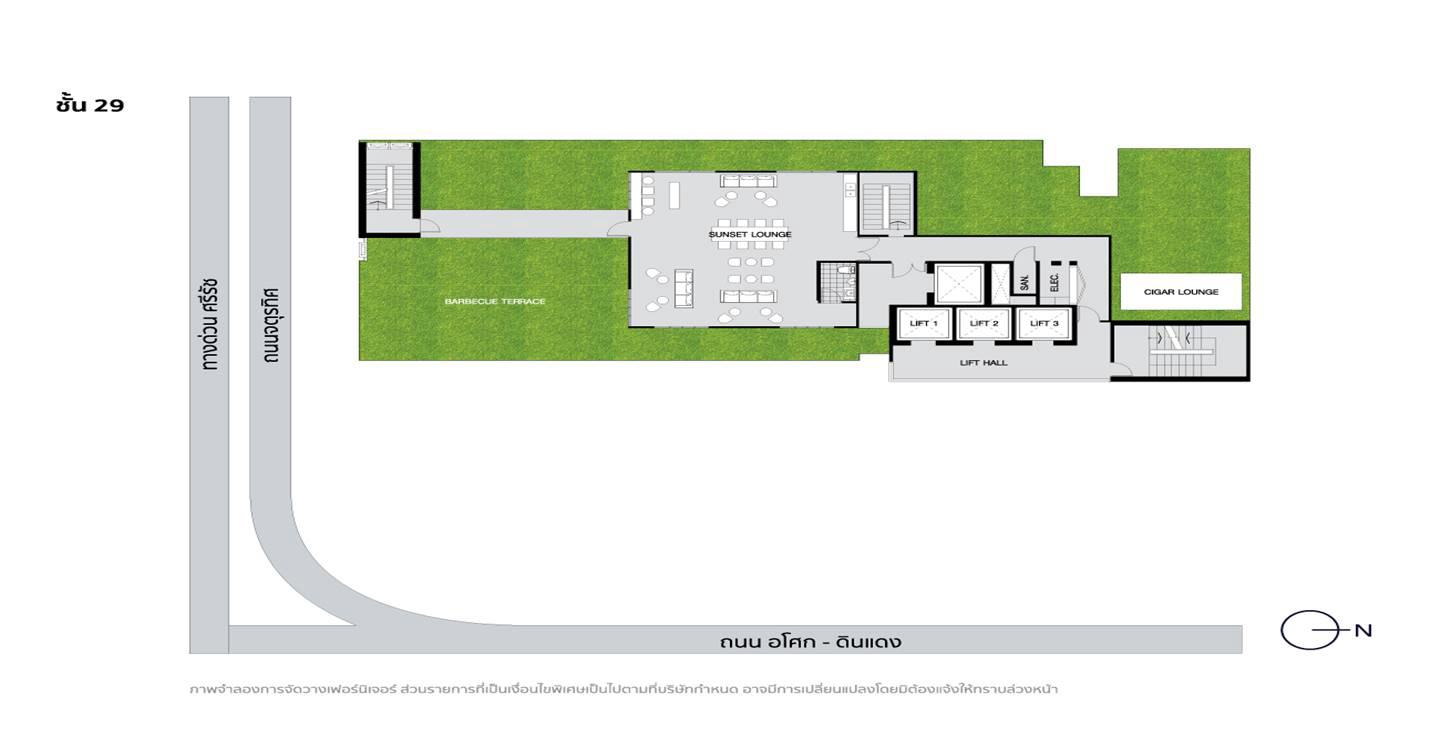 ชั้นที่ 29 ห้องพักผ่อนชมพระอาทิตย์ตกดิน (Sunset Lounge), ระเบียงสำหรับทำบาร์บีคิว (Barbecue Terrace), ห้องซิการ์, สวน