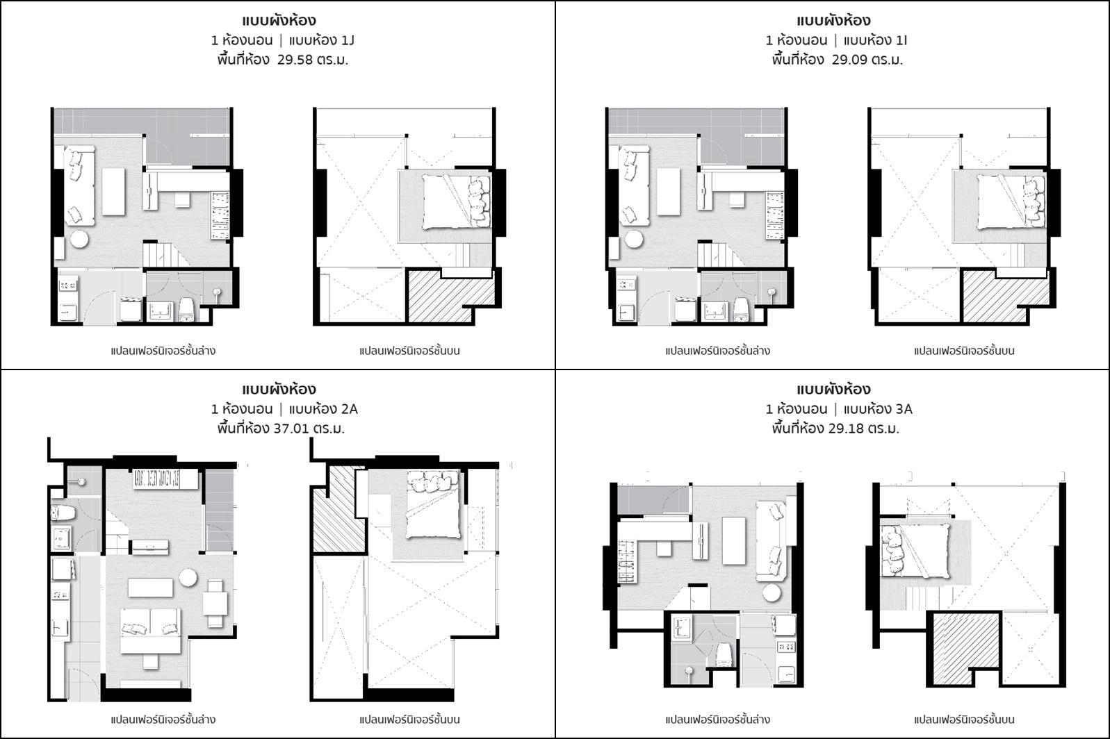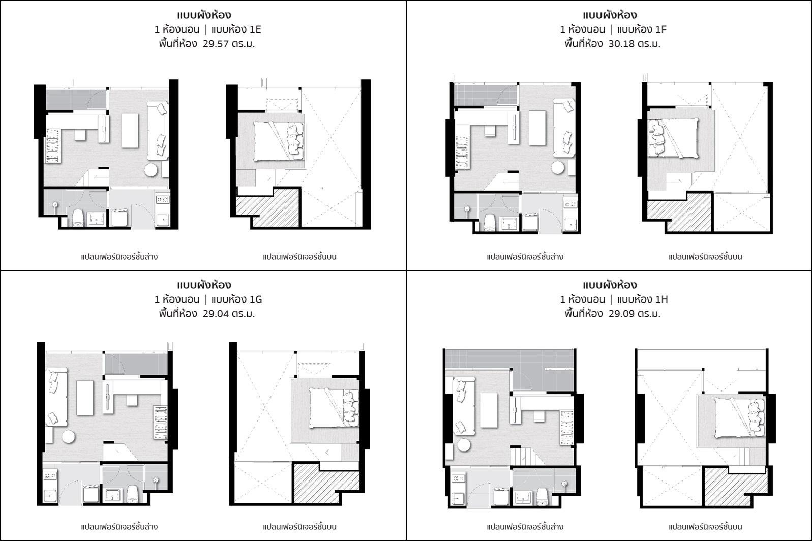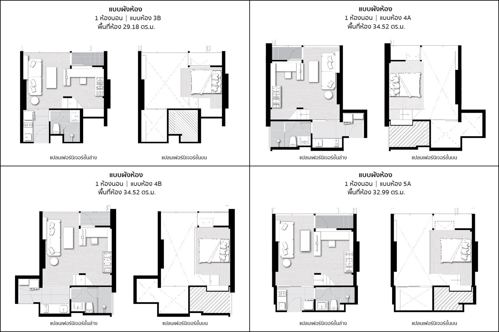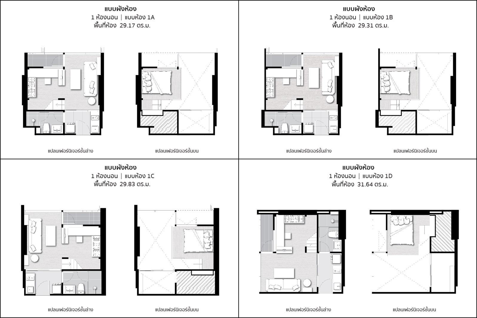 แปลนห้องของ Chewathai Residence Asoke (ชีวาทัย เรสซิเดนซ์ อโศก) คอนโดใกล้แอร์พอร์ตลิ้งค์ มักกะสัน และ MRT พระราม 9 ทั้งหมดเป็นห้อง 1 Bedroom : Loft Duplex ขนาด 29.17 ตร.ม. - 34.52 ตร.ม.
