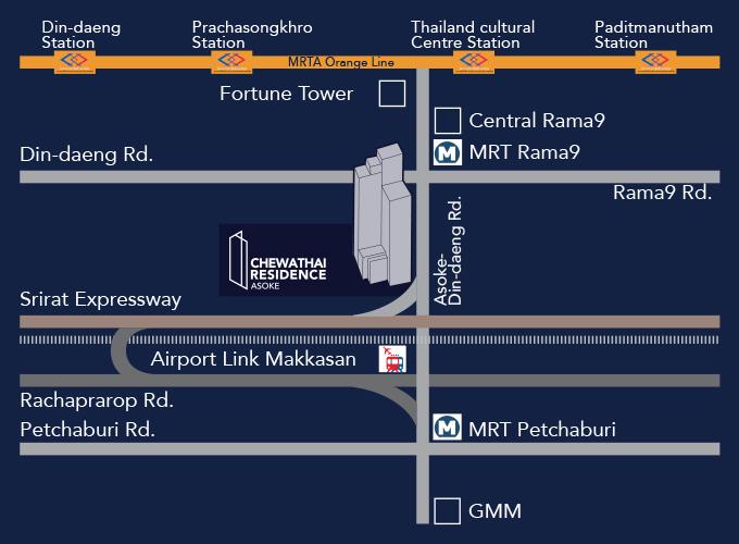 และยิ่งสะดวกมากขึ้น เนื่องจาก Chewathai Residence Asoke (ชีวาทัย เรสซิเดนซ์ อโศก) คอนโดใกล้แอร์พอร์ตลิงค์ มักกะสัน และ MRT พระราม 9 ตั้งอยู่บนทำเลที่เชื่อมต่อกับถนนได้หลายสาย ไม่ว่าจะเป็น ถนนดินแดง, ถนนรัชดาภิเษก และถนนพระราม 9 ที่สำคัญยังใกล้จุดขึ้น-ลงทางพิเศษศรีรัช