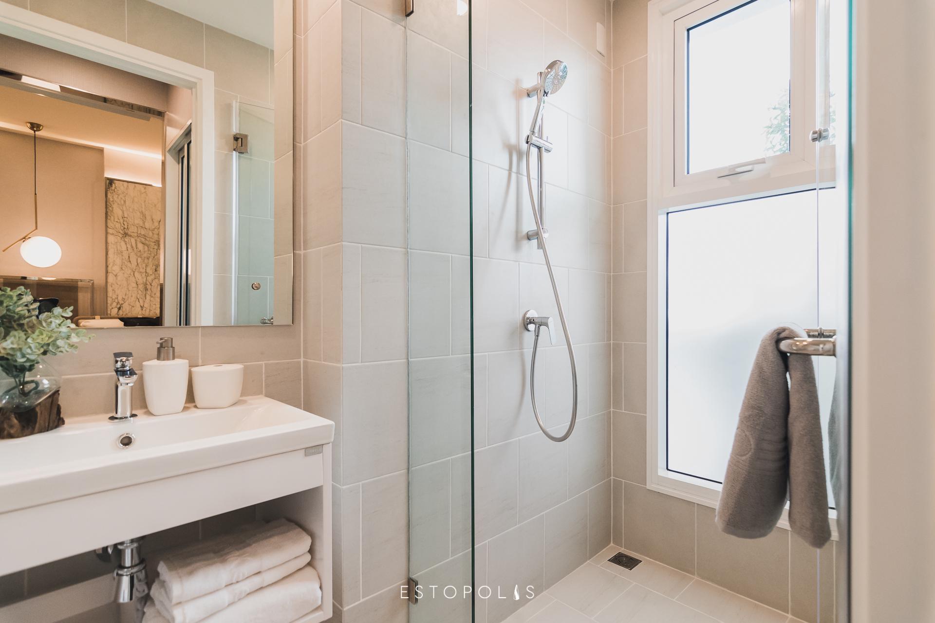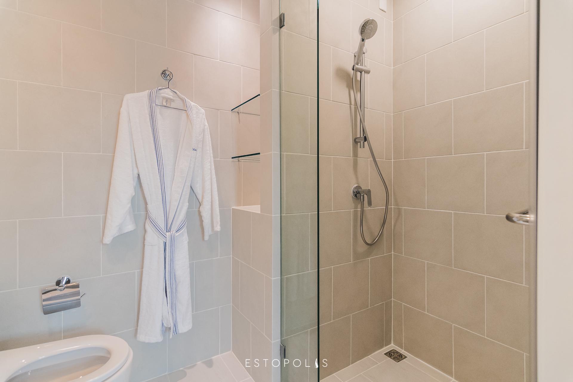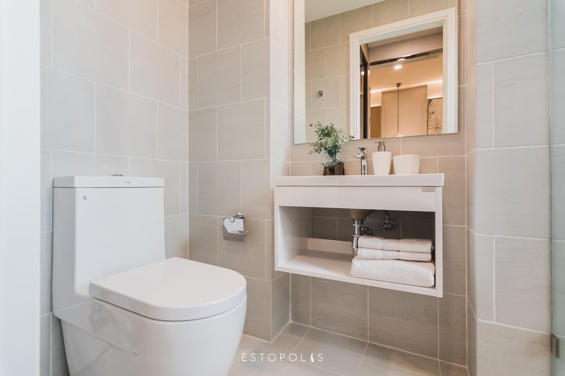 ห้องน้ำติดตั้งสุขภัณฑ์ของ HAFELE ให้ครบเซ็ต ซึ่งจะเป็นมาตรฐานเดียวกันหมดทั้งโครงการ โดยภายในจะแยกโซนแห้งและเปียกด้วยพาร์ทิชั่นกระจก Tempered glass เช่นเดียวกับห้องที่ผ่านมา แต่จะเพิ่มชั้นวางของอยู่ซ้ายมือติดพาร์ทิชั่นเข้ามาเพิ่ม และห้องนี้โถสุขภัณฑ์จะตั้งขนานกับอ่างล้างหน้า โดยหันหน้าเข้าประตูห้องอาบน้ำ