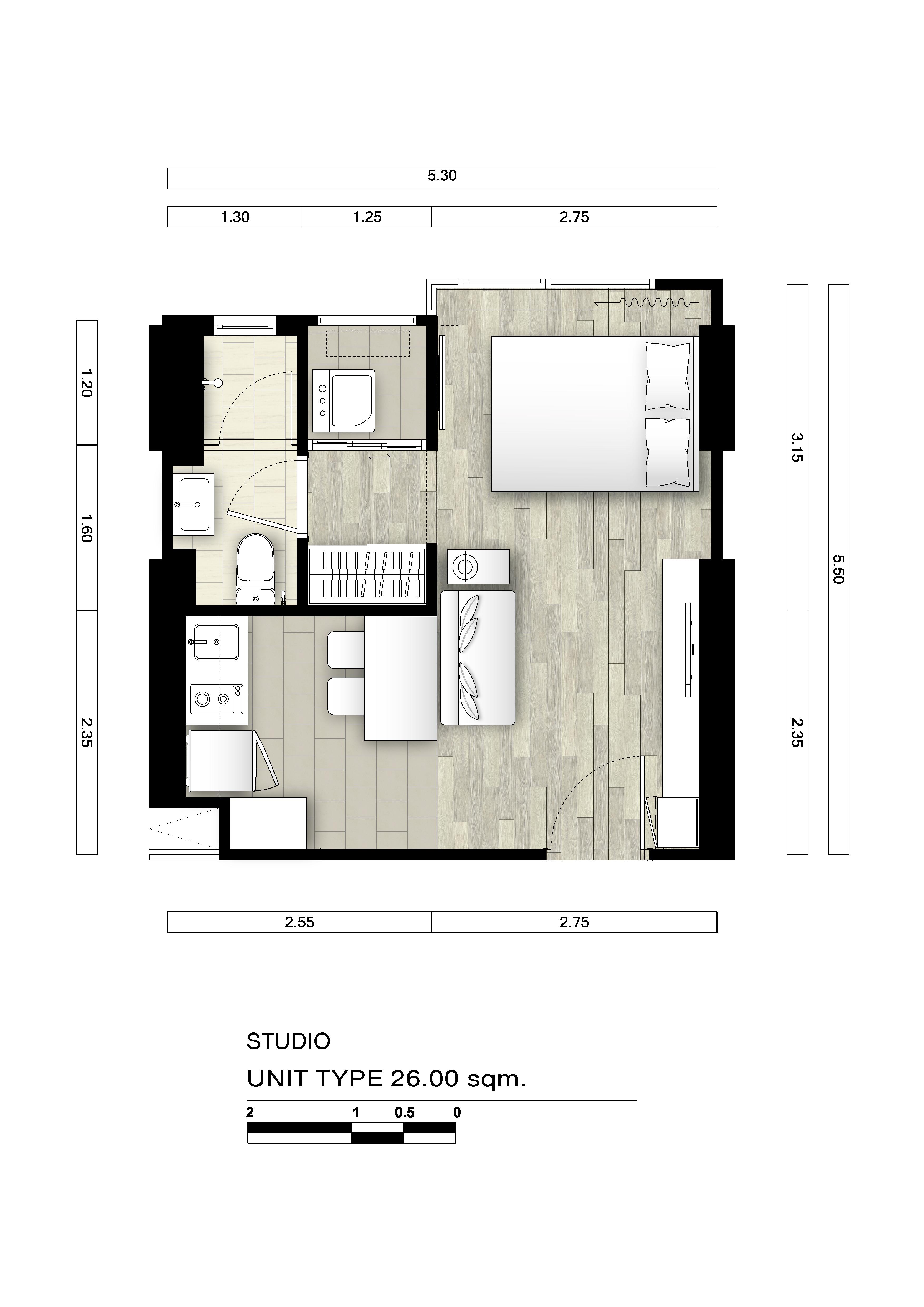 - Studio ขนาดพื้นที่ใช้สอย 26.00 ตารางเมตร