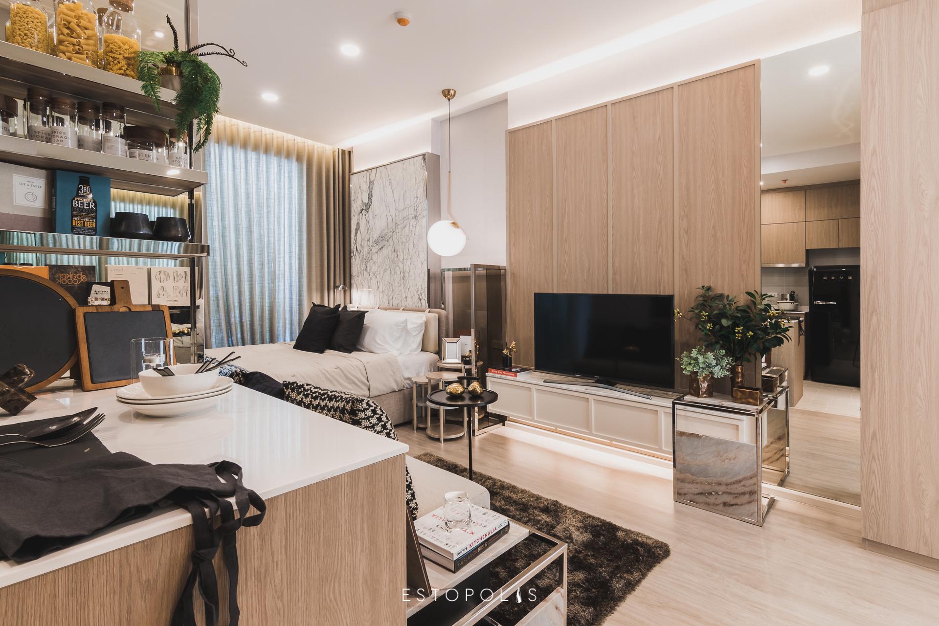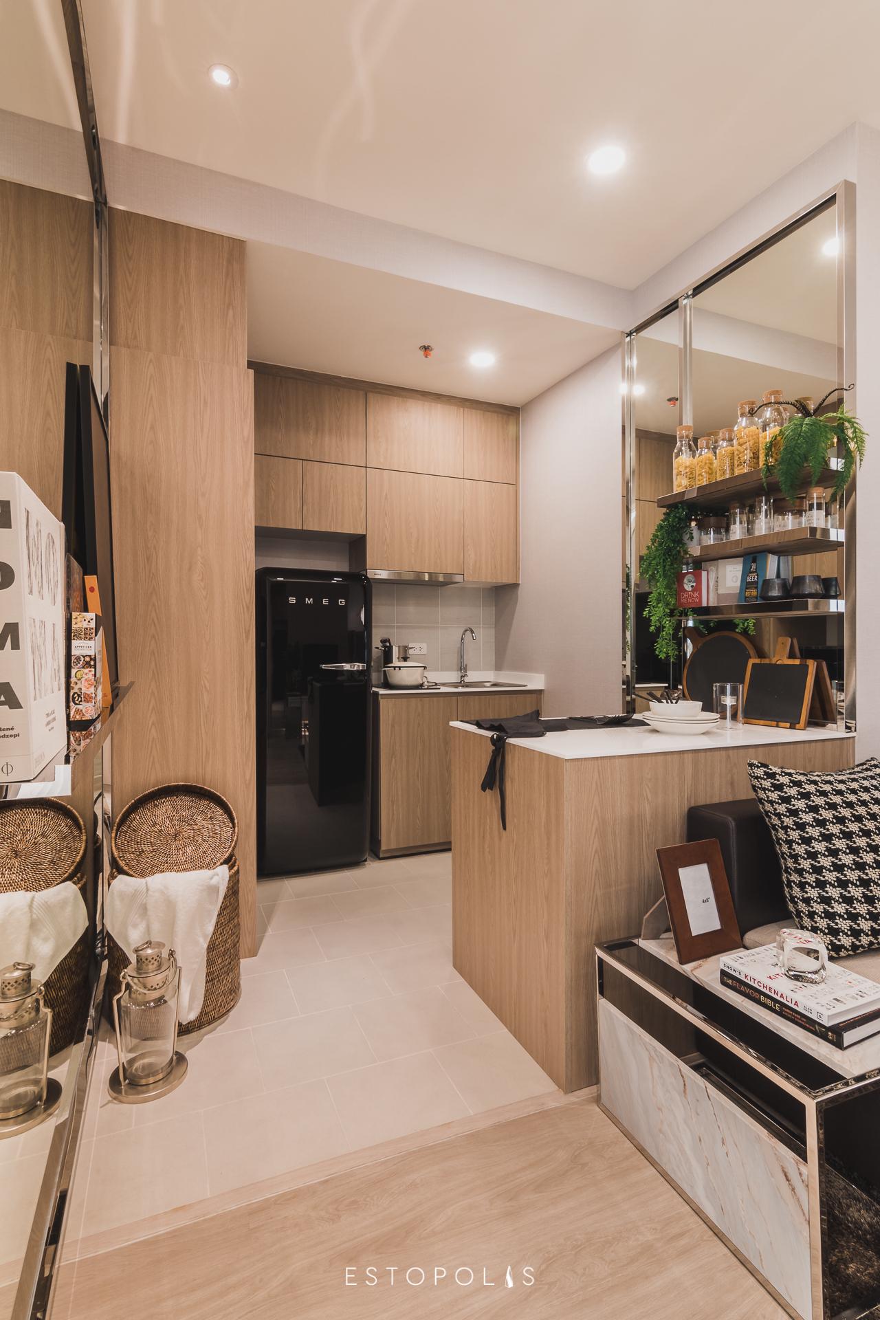 เนื่องจากเป็นห้องแบบ Studio ทุกห้องจึงเชื่อมต่อกัน ในส่วนของห้องครัวจะมี Kitchen Island ซึ่งใช้เป็นมุมรับประทานอาหาร หรือเตรียมอาหาร และกั้นพื้นที่บางส่วนติดกับโซฟาคล้ายห้อง 1 Bedroom Plus ปูด้วยพื้นกระเบื้อง