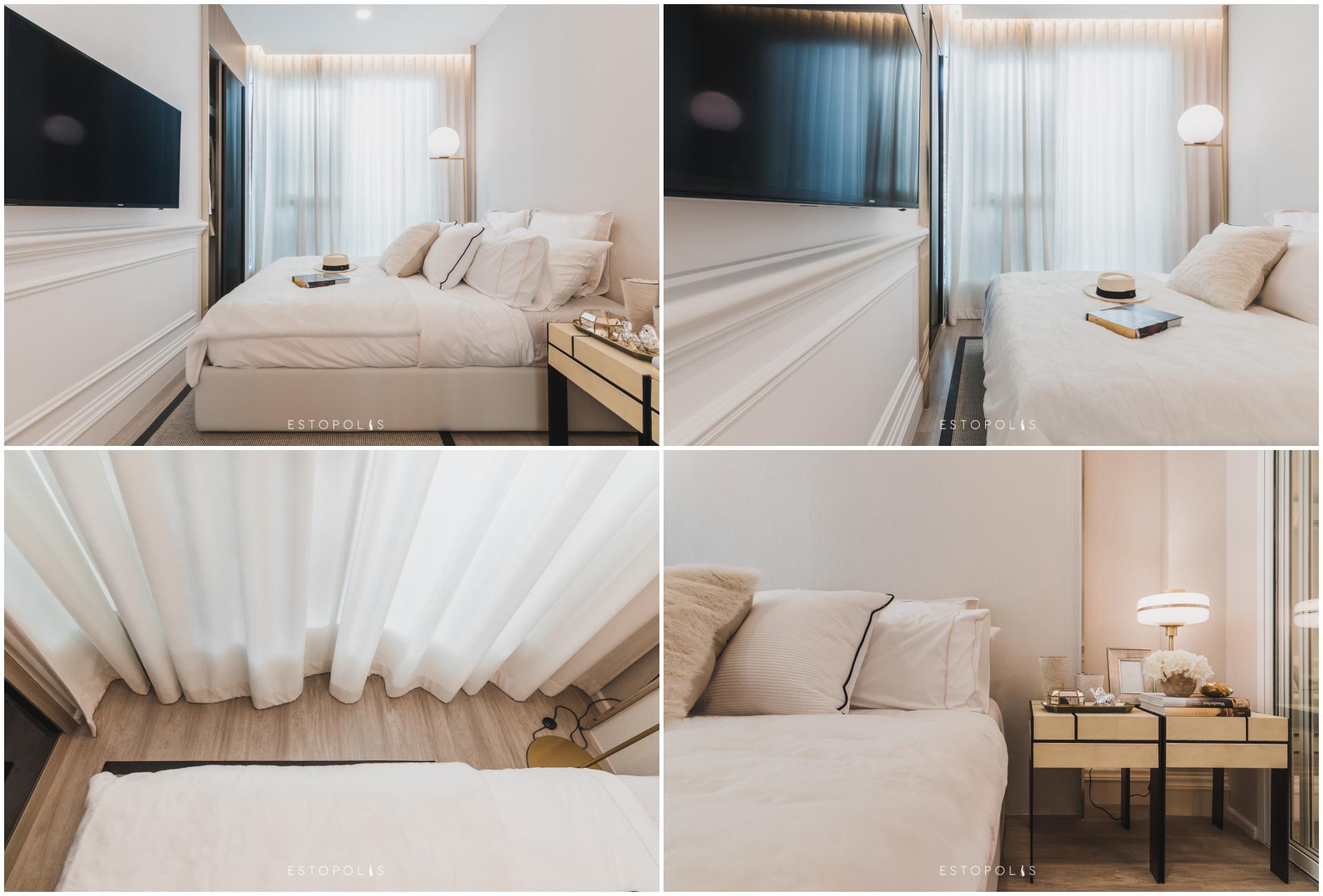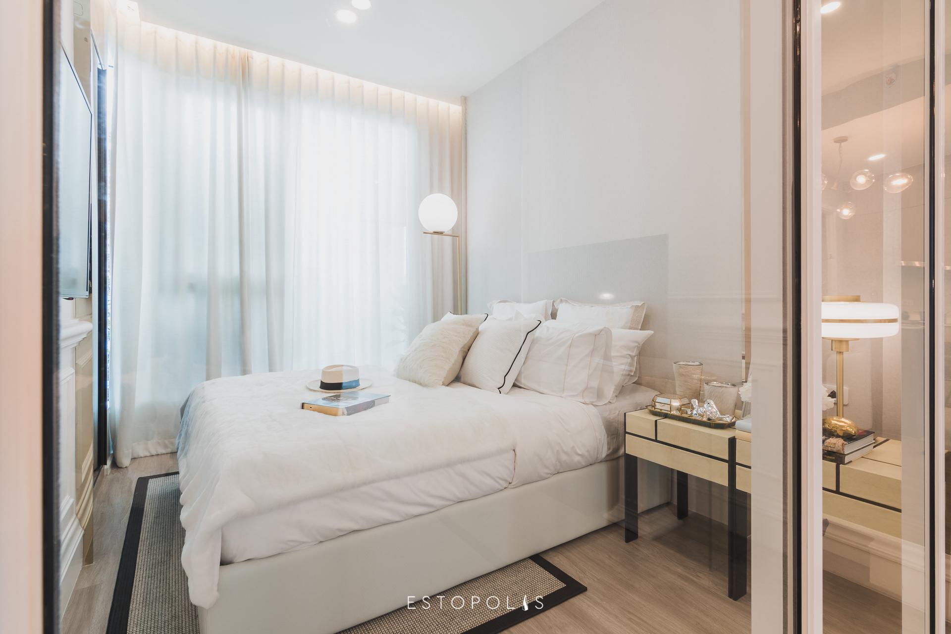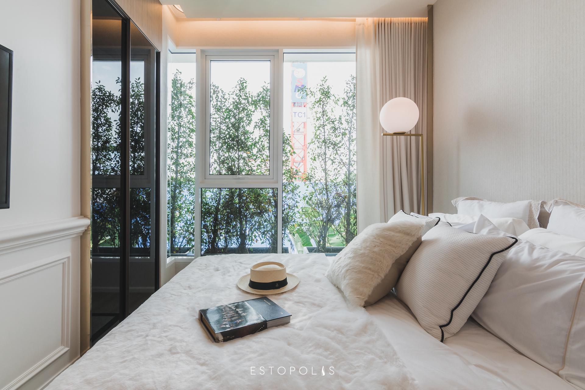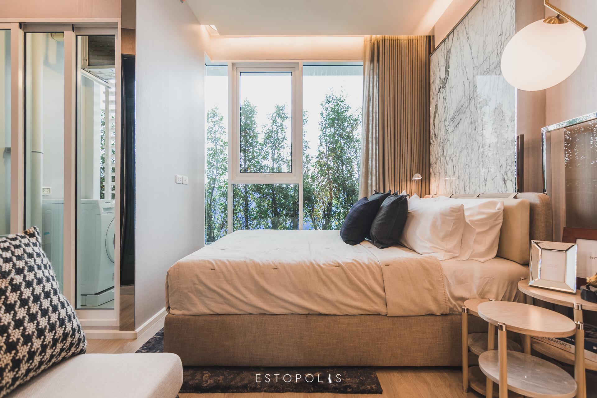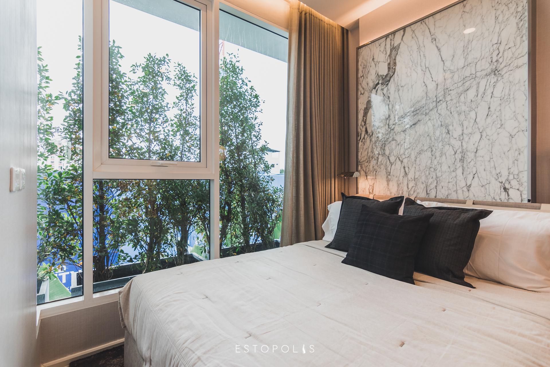 ห้องนอนแบ่งกั้นกับห้องรับแขกด้วยพาร์ทิชั่นกระจกใส พร้อมบานเลื่อนแบบ 3 ตอน เปิดพื้นที่ใช้งานได้มากยิ่งขึ้น เมื่อก้าวเข้ามาจะเห็นว่า โทนห้องเป็นสีเอิร์ธโทน เพื่อเน้นความสบายตาหรือให้ผู้อยู่อาศัยสามารถตกแต่งเพิ่มได้ง่ายมากขึ้น