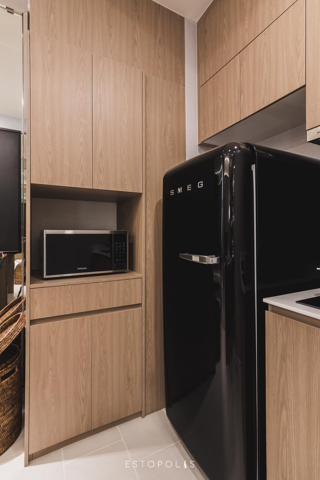 มีชุดครัว Built-in ลามิเนตจากทางโครงการจะมีรูปแบบเหมือนกันหมด แต่ห้อง Studio จะพิเศษตรงที่จะมีตู้ชั้นแยกออกมา ไว้วางไมโครเวฟ และเก็บของอื่น ๆ ได้เพิ่มมากขึ้น พร้อมจัดช่องวางตู้เย็นไว้ให้