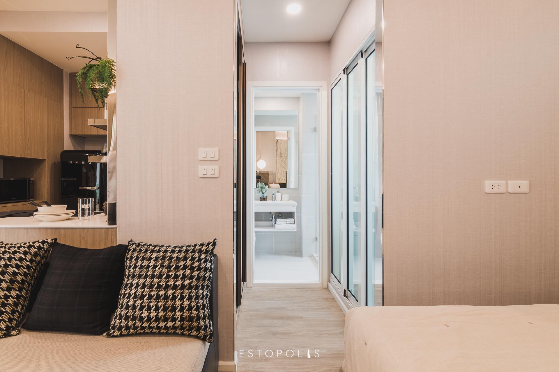 - ประตูเข้าห้องจะเป็นประตูบานสำเร็จรูป HDF สูง 2.4 เมตร เมื่อเปิดเข้ามาจะเจอห้องรับแขกและห้องนอนตั้งอยู่ในแนวเดียวกัน กั้นด้วยด้วยพาร์ทิชั่นกระจกใส ให้ความรู้สึกปลอดโปร่ง ไม่อึดอัดที่สำคัญเป็นพาร์ทิชั่นบานเลื่อนแบบ 3 ตอน เปิดพื้นที่ใช้งานได้มากยิ่งขึ้นกว่าที่เคย