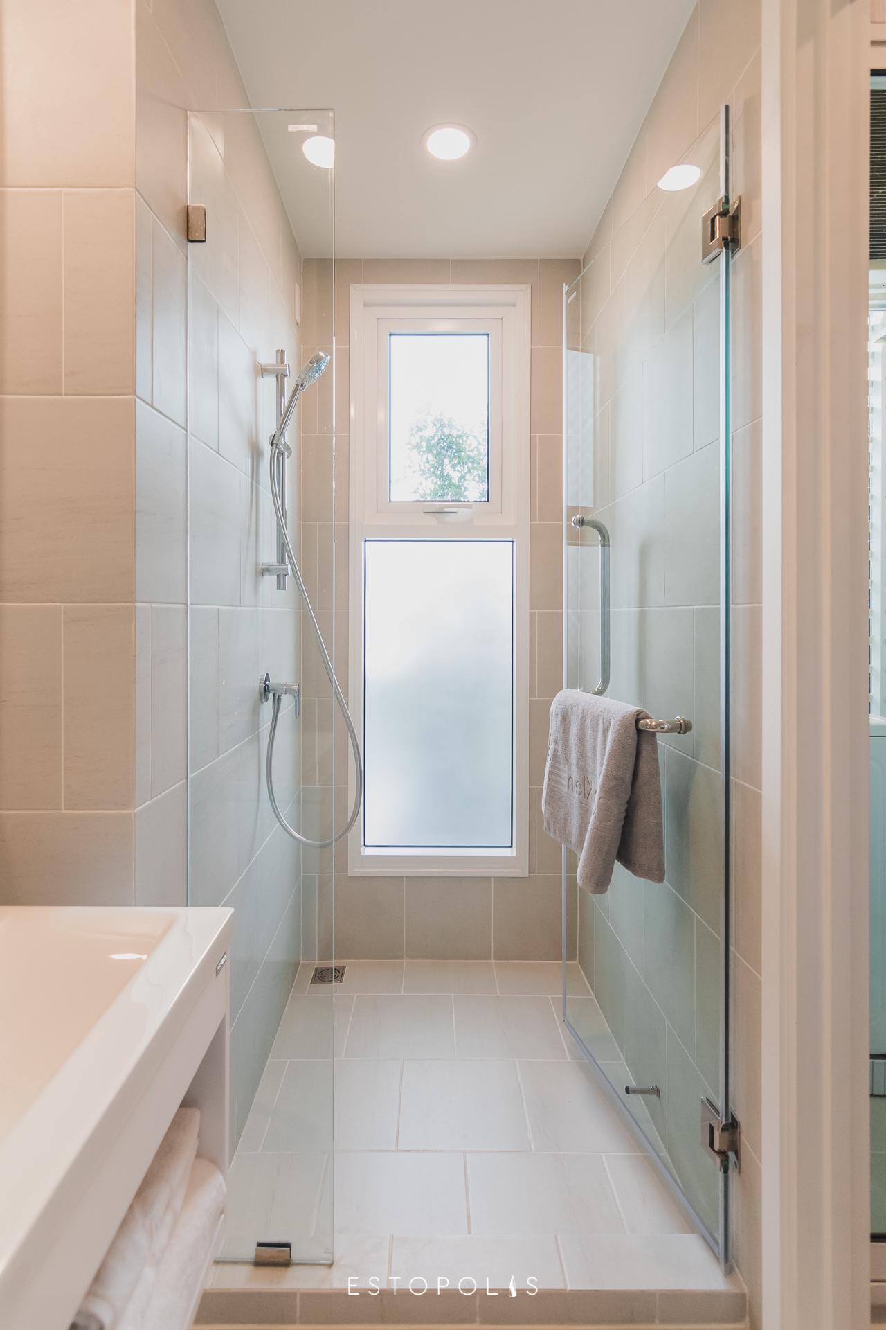 อีกฝั่งจะเป็นโซนเปียกที่กั้นด้วยพาร์ติชั่นกระจก Tempered glass เช่นเคย และพิเศษตรงที่มีหน้าต่างติดฟิลม์ขุ่นขนาดใหญ่ไว้รับแสงสว่างตลอดวัน หรือหากใครอยากให้มีอากาศถ่ายเท จะเปิดรับลมก็สามารถทำได้เพราะด้านบนเป็นแบบบานกระทุ้ง เปิด - ปิด สะดวก