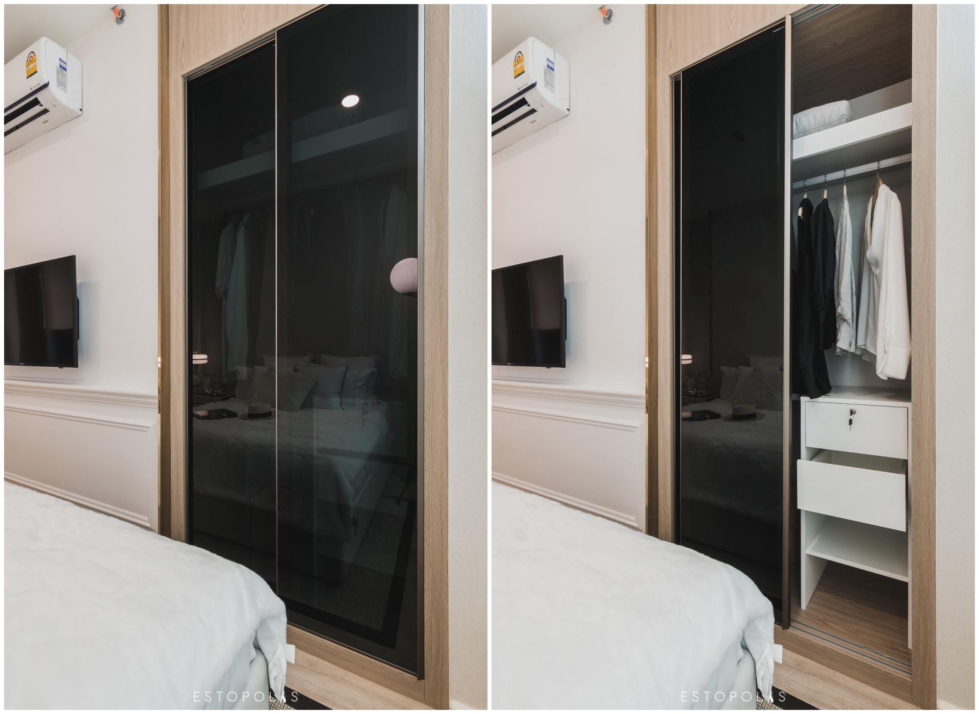 สำหรับตู้เสื้อผ้าบิ้วท์อินของทางโครงการ จะใช้เป็นตู้เสื้อผ้ากระจกสีชาแบบโปร่งแสง