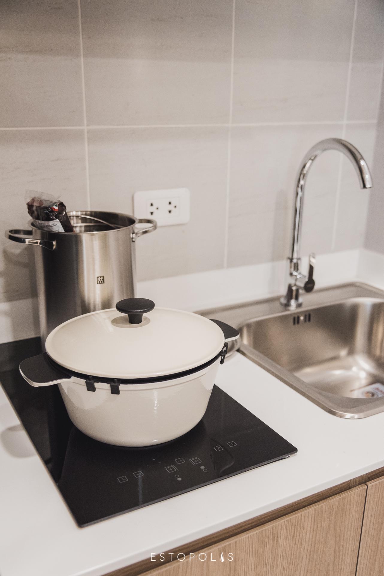 ชุดครัวมีขนาดใหญ่กว่าห้องแรกเล็กน้อย เนื่องจากไม่มีพื้นที่ห้องอเนกประสงค์ ส่วน Top ครัวเป็นหินสังเคราะห์สีขาวเหมือนห้องแรก และมีปลั๊กไฟให้ใช้งานเครื่องใช้ไฟฟ้าเล็กๆ อย่าง เครื่องปิ้งขนมปัง หรือเครื่องทำกาแฟ ตู้เก็บของด้านบนจะแบ่งช่องและฟังก์ชั่นให้หลากหลาย บานเปิด-ปิดเป็น Soft Close ทั้งหมด
