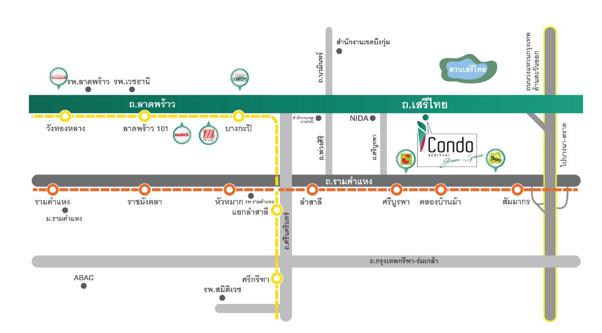 - สำหรับโครงการรถไฟฟ้าสายสีส้ม จะมีกำหนดการแล้วเสร็จช่วงปี 2563 โดยสถานีที่ใกล้กับโครงการ Icondo Serithai Green Space (ไอคอนโด เสรีไทย กรีน สเปซ) มากที่สุดจะเป็น สถานีศรีบูรพา ที่ห่างจากโครงการประมาณ 1.5 กิโลเมตร ซึ่งเป็นสายที่สามารถพาเราเข้าสู่เขต New CBD พระราม 9 ได้ในเวลาอันรวดเร็ว โดยไปสิ้นสุดที่ สถานีศูนย์วัฒนธรรม