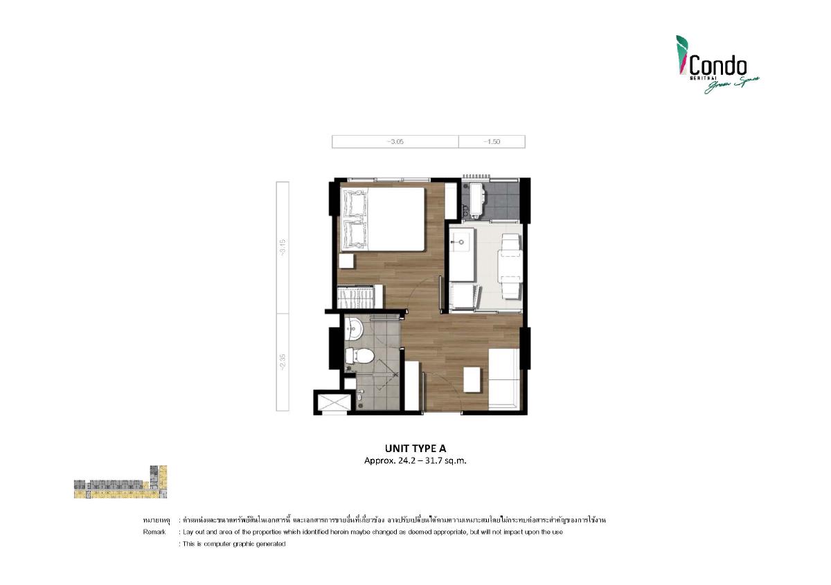 ห้อง Type A ขนาดพื้นที่ใช้สอย 24.2 - 31.7 ตารางเมตร