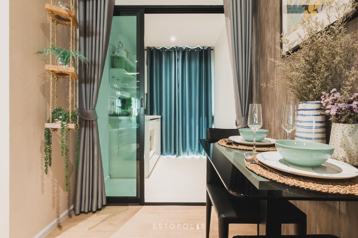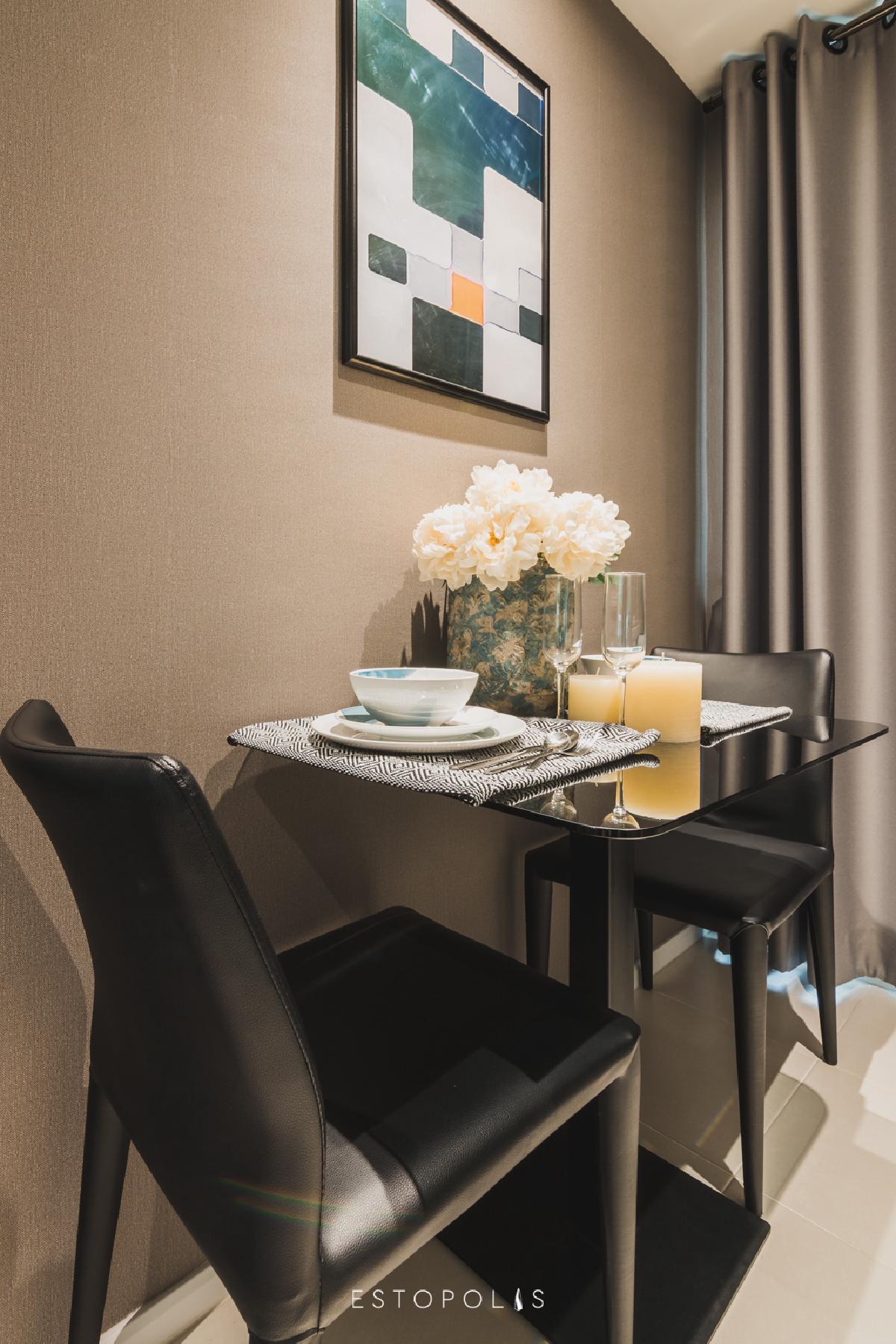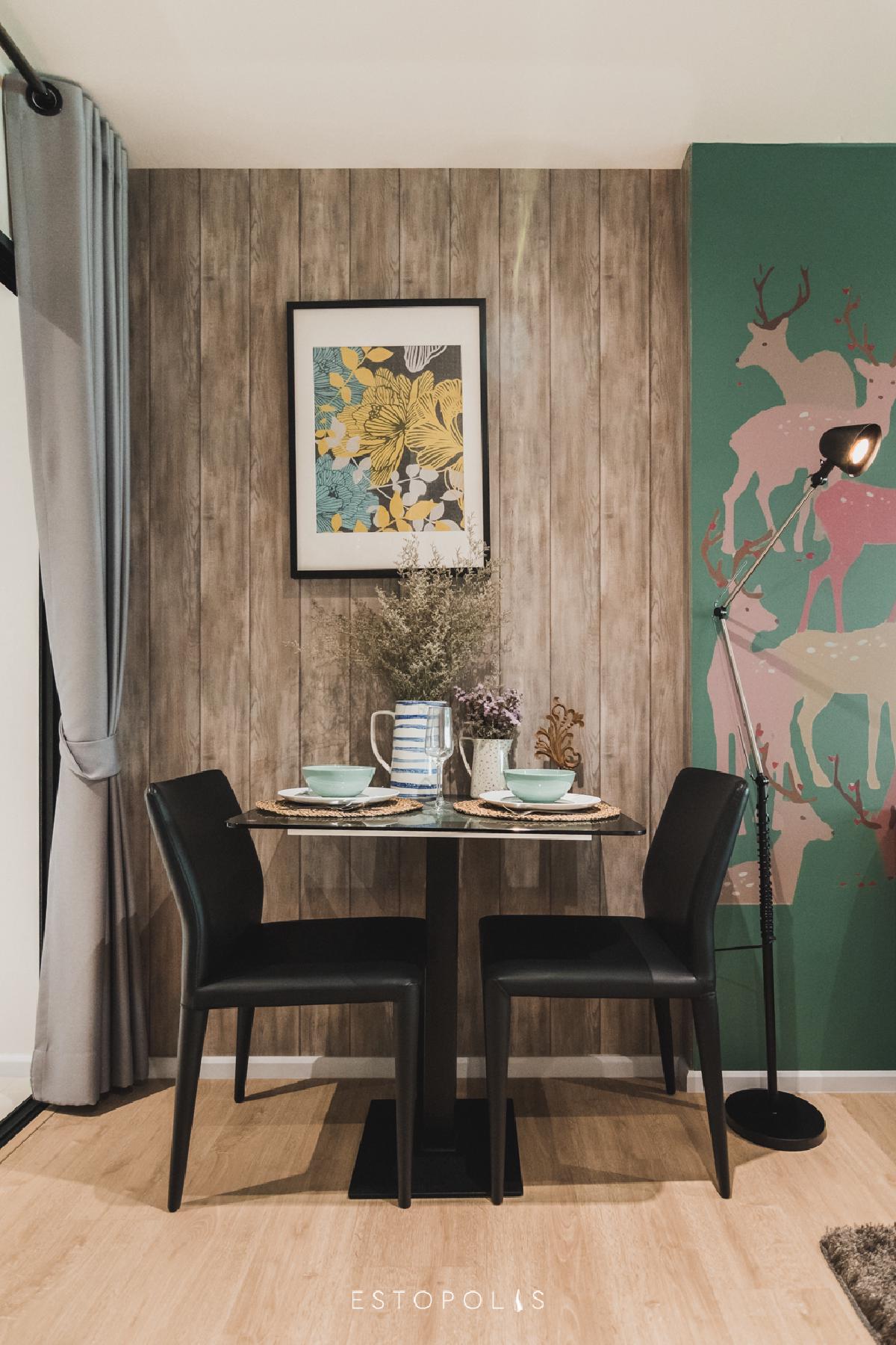 มุมทานอาหารสำหรับผู้พักอาศัย 1-2 คน หรือหากใครอยากได้มุมทำงานส่วนตัว อาจย้ายโต๊ะทานข้าวเข้าไปไว้ในห้องครัว แล้วหาชั้นหนังสือสูงๆ มาตั้งไว้ข้างโซฟา เพียงเท่านี้เราก็จะได้ทั้งมุมทำงานและมุมพักผ่อนในห้องเดียว แถมยังมีพื้นที่เก็บของมากขึ้นอีกด้วย