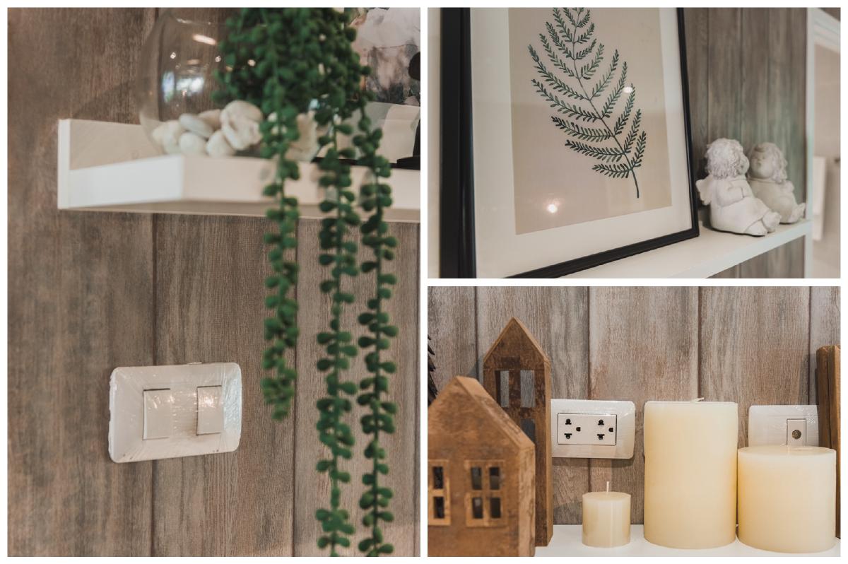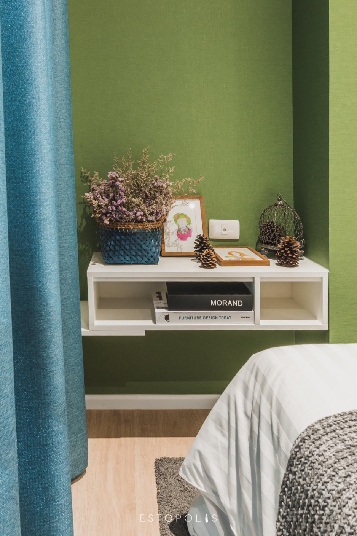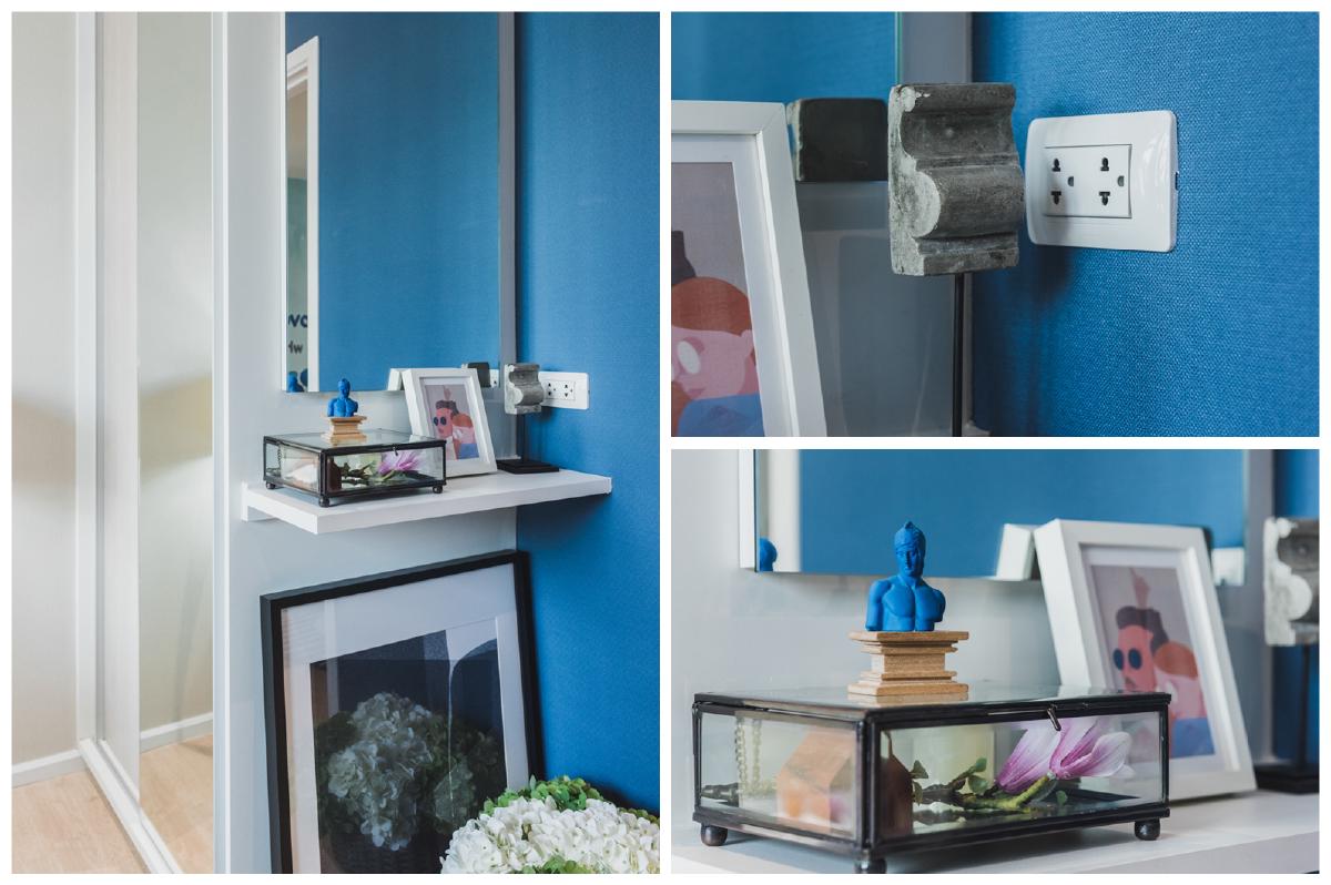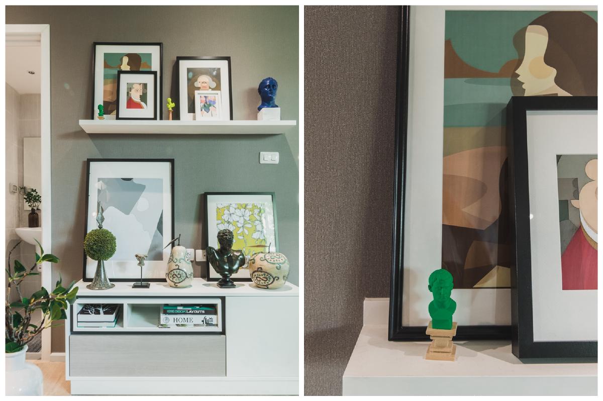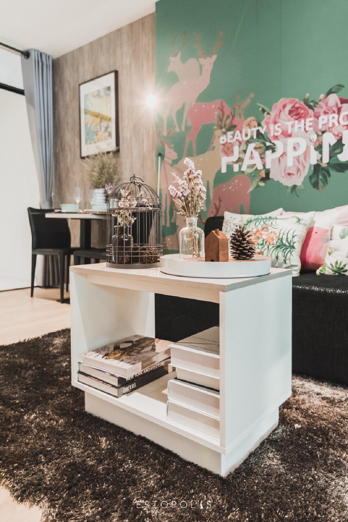 ข้างโซฟายังสามารถตั้งชั้นเก็บของทรงสูงเอาไว้จัดระเบียบห้อง หรือจะตั้งโคมไฟอย่างห้องตัวอย่างก็ได้ โดยห้องจริงจะไม่ได้ตกแต่งวอลล์เปเปอร์ผนังมาให้แบบนี้ เราอาจเปลี่ยนมา Built in ชั้นวางของติดผนังแทน เพื่อเพิ่มประโยชน์ในการใช้งาน