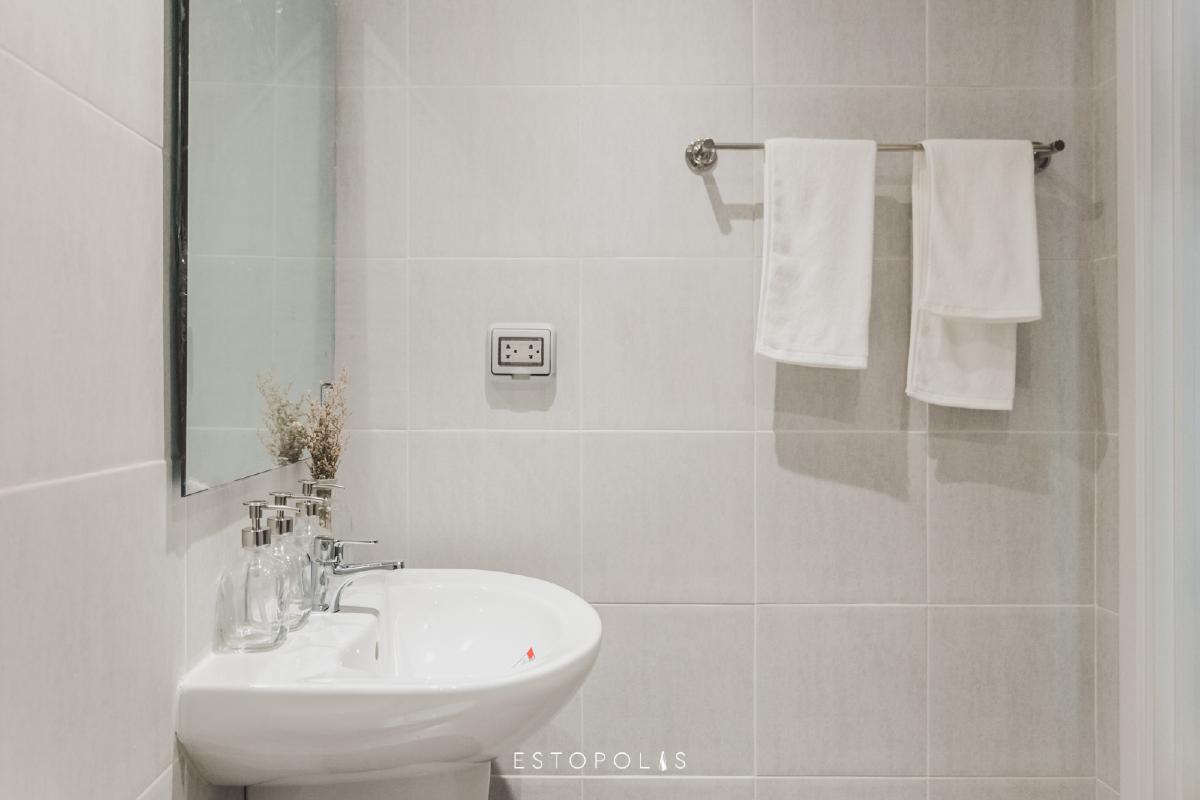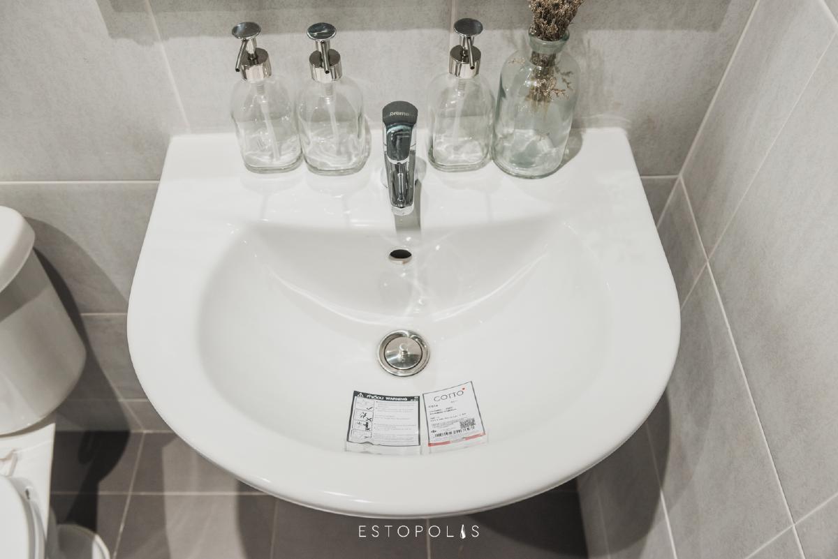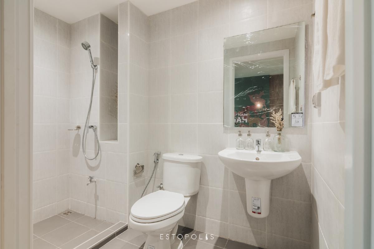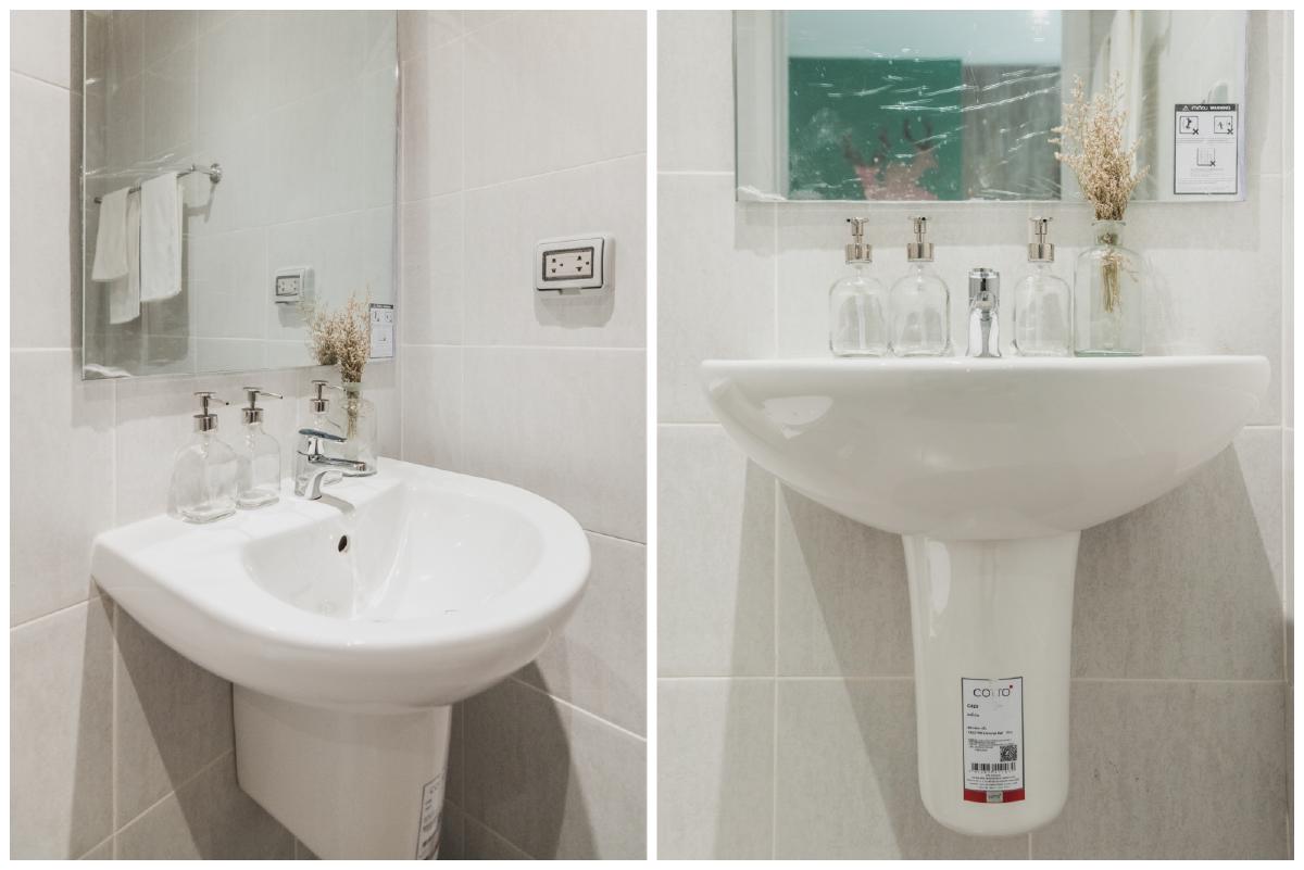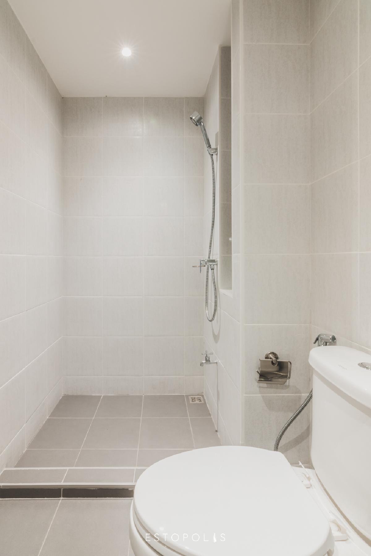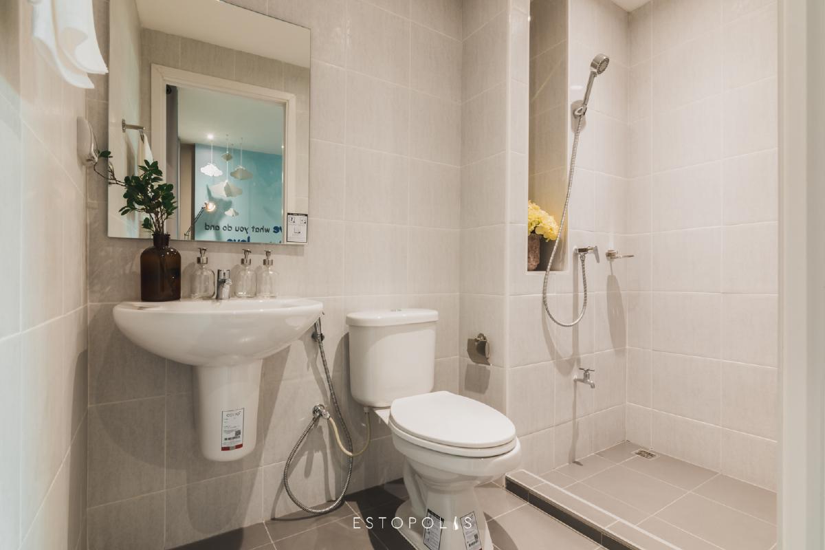 ห้องน้ำพร้อมสุขภัณฑ์จาก Cotto ที่ติดตั้งให้ทั้งอ่างล้างหน้า , โถสุขภัณฑ์ และชุดฝักบัวของ Prema โดยทางโครงการ Icondo Serithai Green Space (ไอคอนโด เสรีไทย กรีน สเปซ) จะแยกโซนแห้งและเปียกให้ ซึ่งเราสามารถติดราวแขวนผ้าม่านหรือแพลทติชั่นเพิ่มได้เอง เพื่อป้องกันน้ำกระเด็น ส่วนพื้นและผนังปูกระเบื้องโทนขาวเทาเข้ากับสีสุขภัณฑ์