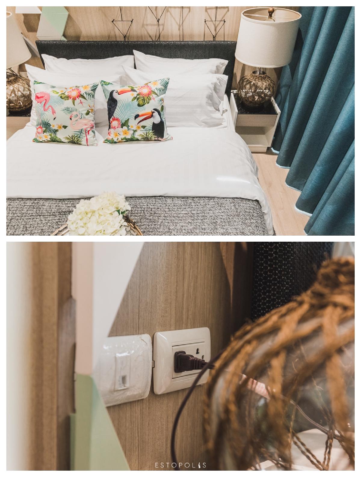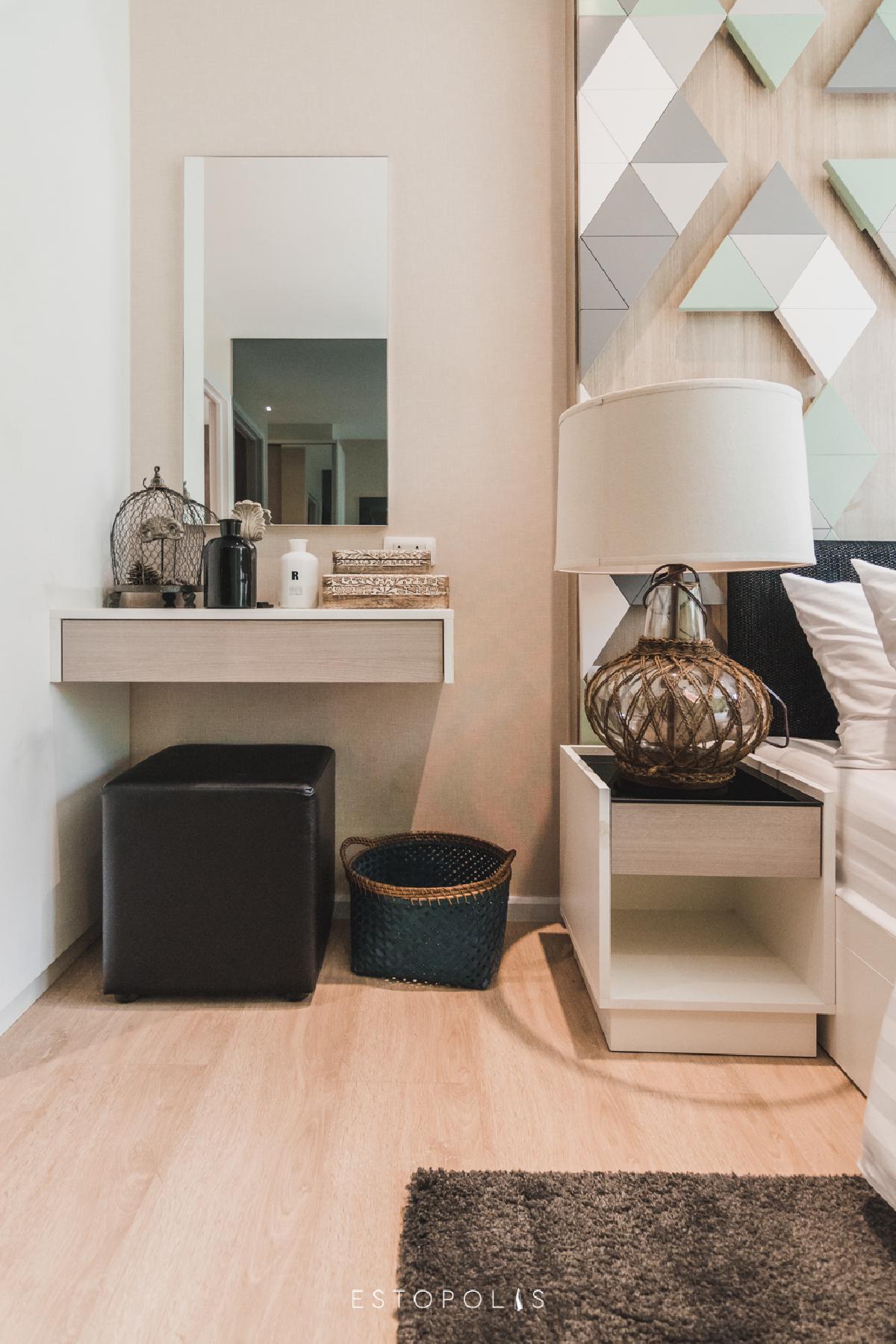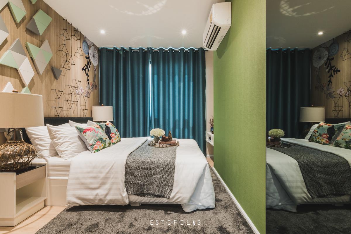 ขยับเข้ามาที่ ห้องนอน ซึ่งจะมีขนาดเล็กกว่าห้องแรกเล็กน้อย แต่เฟอร์นิเจอร์ที่ได้จะคล้ายกัน ได้แก่ ฐานเตียงขนาด 5 ฟุต , โต๊ะหัวเตียง 1 ตัว , ตู้เสื้อผ้า และชั้นวางโทรทัศน์ โดยทางโครงการได้ตกแต่งเพิ่มกระจกไว้ตรงปลายเตียง เพื่อช่วยให้ห้องดูมีมิติและกว้างขวางขึ้น ภายในติดไฟดาวน์ไลท์เรียบไปกับเพดาน ให้บรรยากาศแบบรีสอร์ท