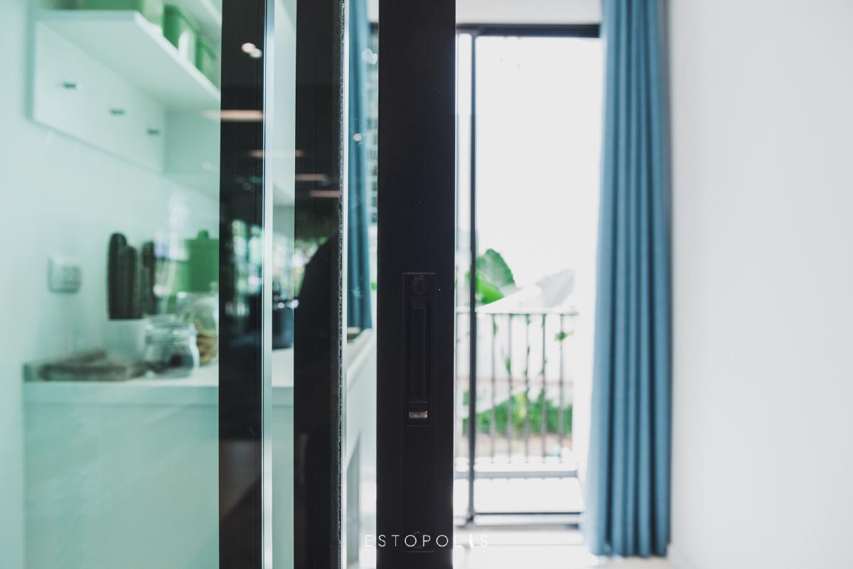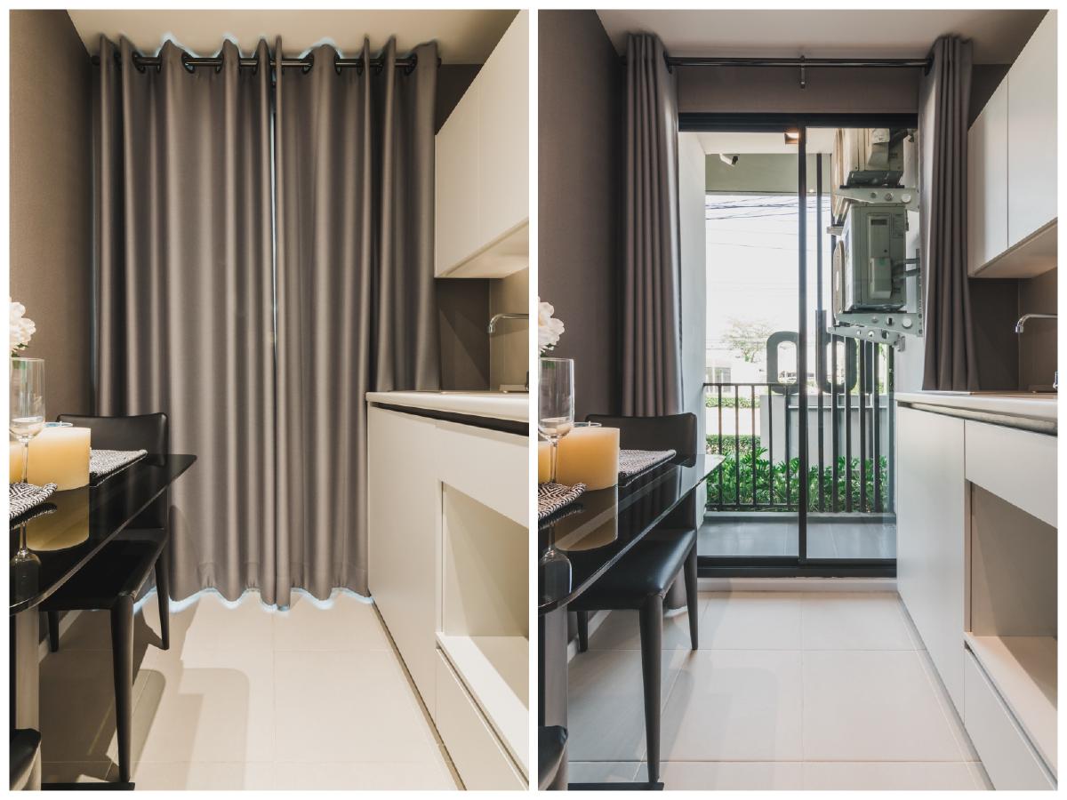 ห้องครัวแบบปิด กั้นด้วยแพลทติชั่นกระจก เพื่อป้องกันกลิ่นและควันรบกวน และเมื่อถัดเข้าไปด้านในจะเห็นว่าได้เชื่อมกับระเบียงด้านนอก ทำให้ถ่ายเทอากาศได้สะดวกยิ่งขึ้น