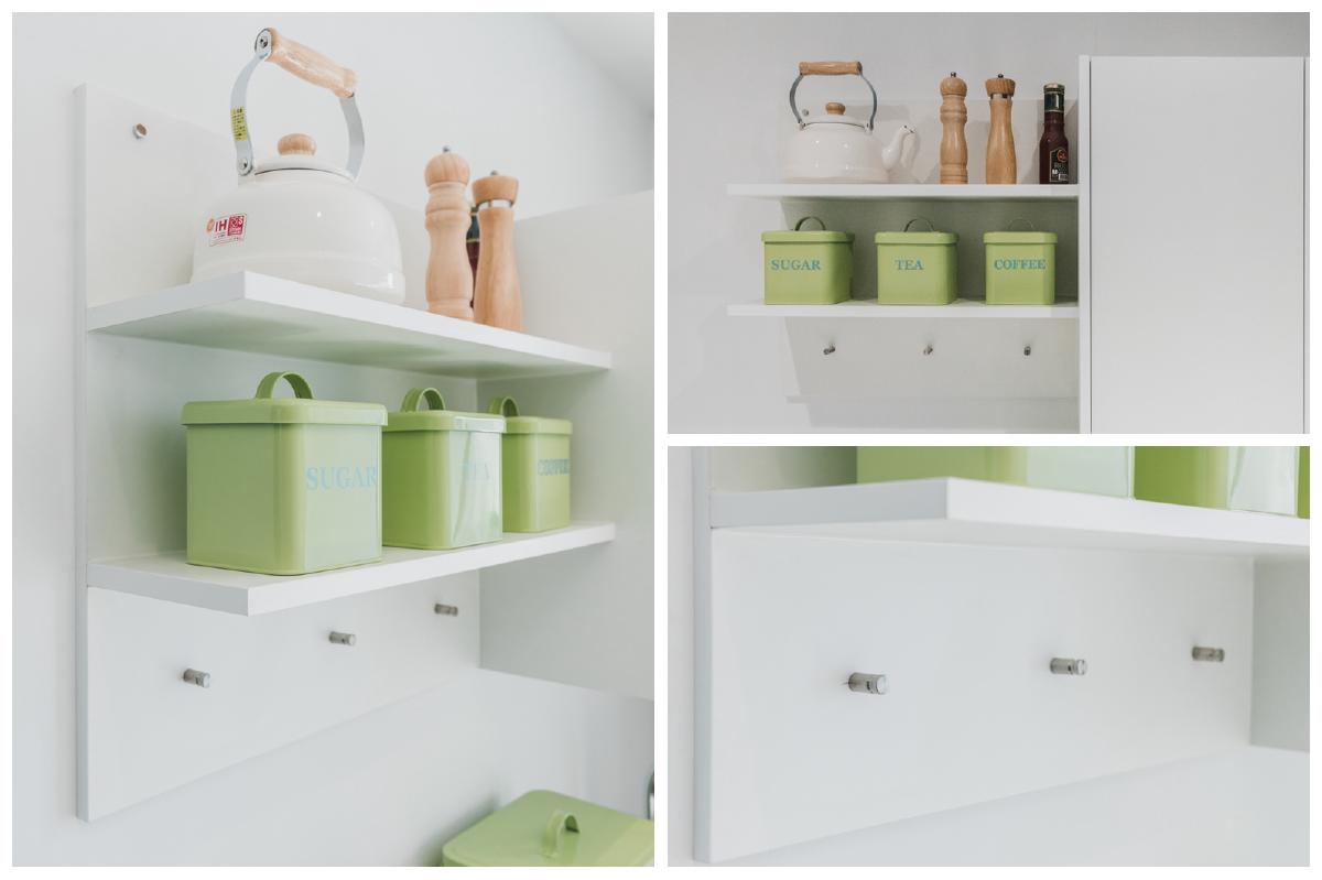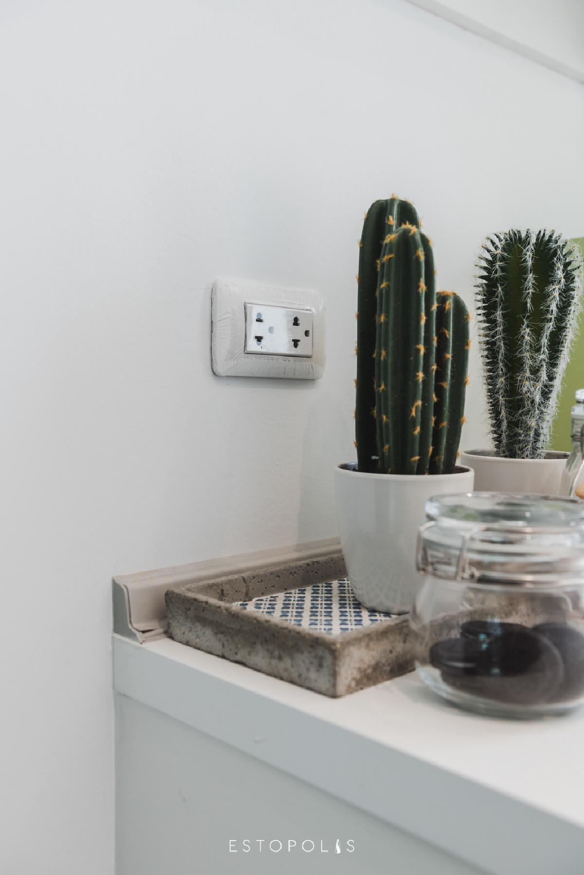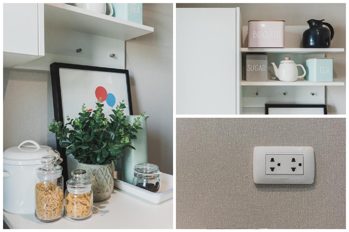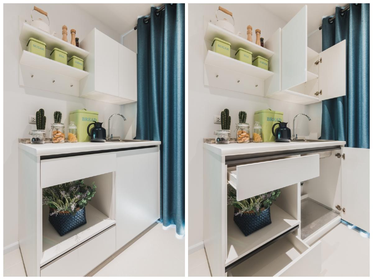 Top ครัวมีพื้นที่ให้วางของ วางเครื่องใช้ไฟฟ้าขนาดเล็กได้ ส่วนชั้นบนยังคงเป็นแบบเดียวกัน คือมีตู้ , ชั้นและที่แขวนผ้าเช็ดมือ ทัพพี พร้อมปลั๊กสำหรับต่อใช้งานตู้เย็น