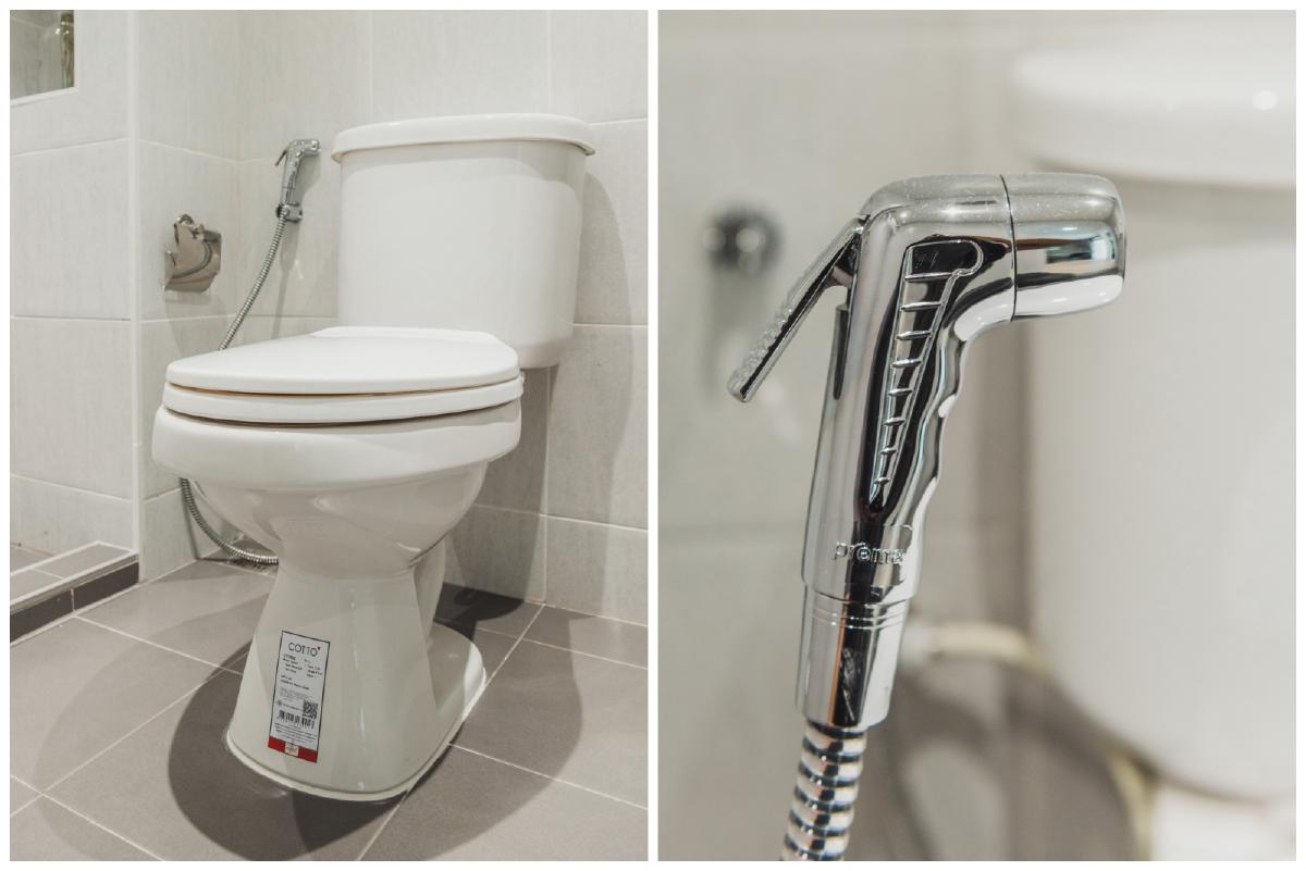 ถัดเข้าไปเป็นโถสุขภัณฑ์จาก Cotto เช่นกัน หัวฉีดแบบโครเมี่ยมจาก Prema แข็งแรงทนต่อแรงกระแทก