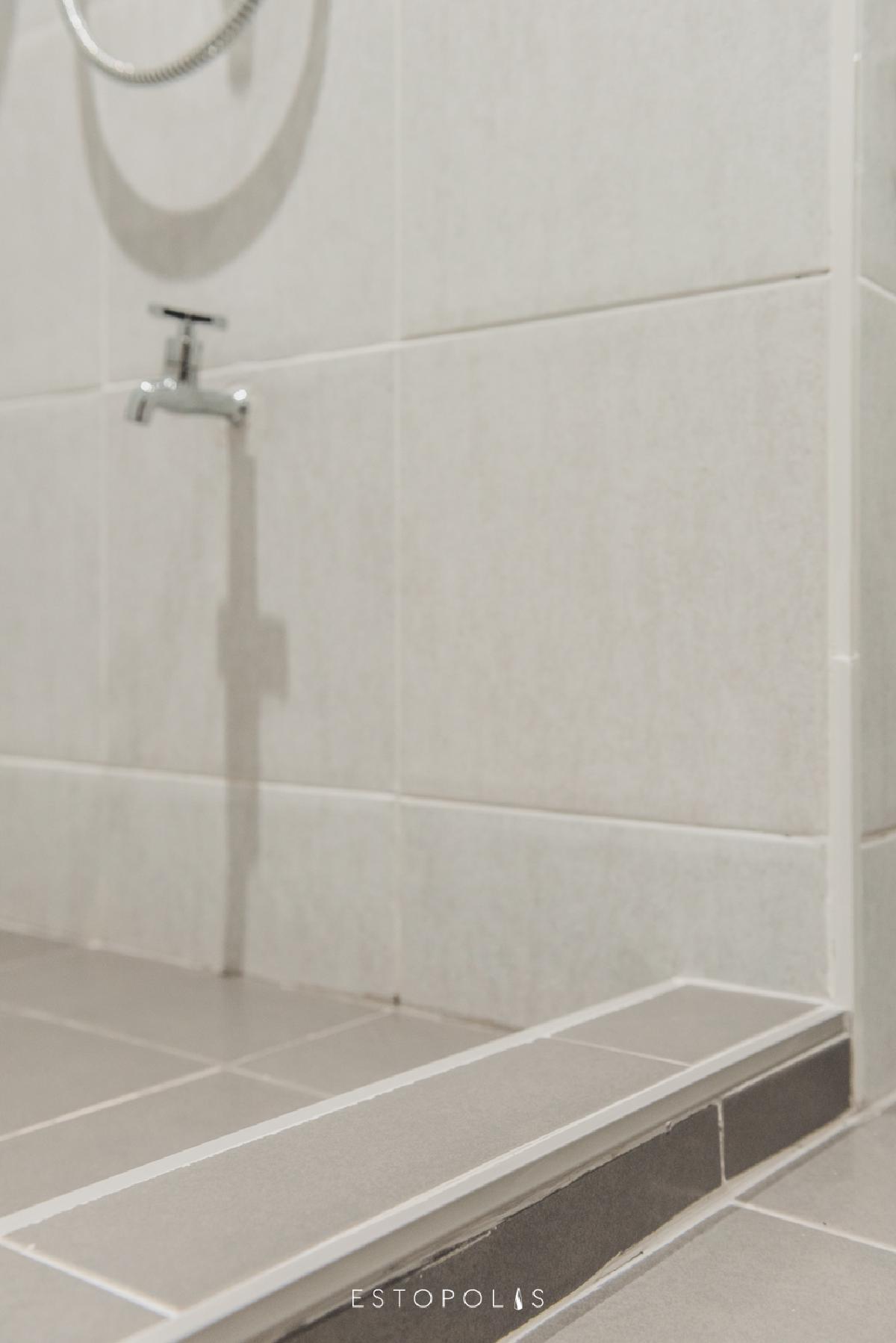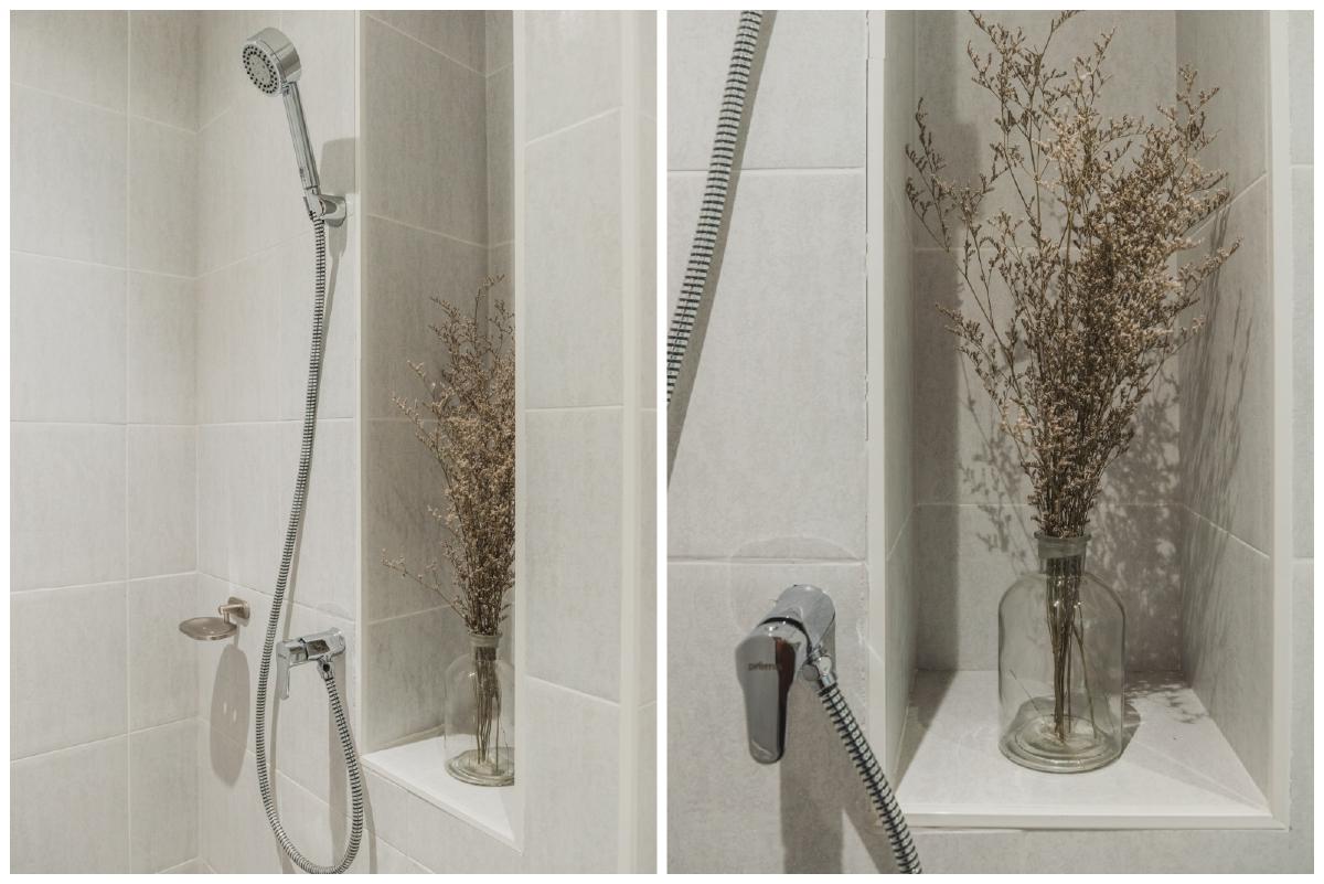 ชุดฝักบัวถูกติดตั้งไว้คู่กับช่องเก็บของ ที่ใช้วิธี Drop Wall เข้าไปเพื่อไม่ให้เกะกะพื้นที่ห้องอาบน้ำ นอกจากนี้เราอาจซื้อชั้นวางมาตั้งไว้ข้างใน เพื่อเพิ่มฟังก์ชั่นช่องเก็บของให้เก็บได้มากขึ้น