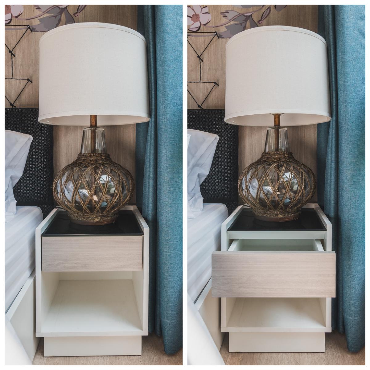 หัวเตียงวางโต๊ะขนาดเล็กให้ 2 ตัวซ้ายขวา พร้อมปลั๊กไฟและจุดต่อสาย LAN ฝั่งละ 1 จุด