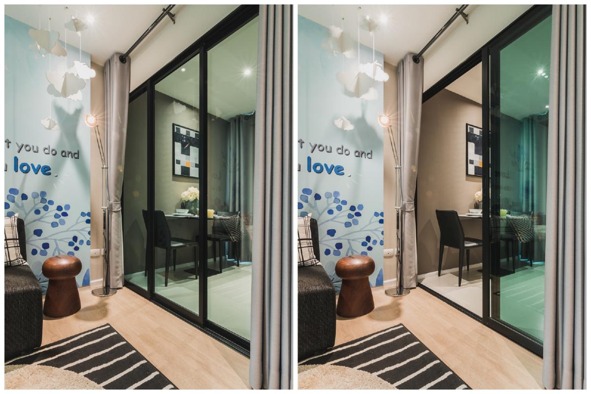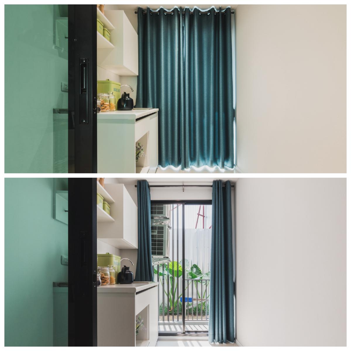 ห้องครัวแบบปิดกั้นด้วยแพลทติชั่นบานเลื่อนแบบ 3 ตอน โดยใช้บานกระจกแบบตัดแสง เพื่อช่วยลดความร้อนและแสงแดดที่จะสะท้อนเข้ามาในห้อง หรืออาจแขวนผ้าม่านบังอีกชั้นหนึ่งอย่างในห้องตัวอย่าง